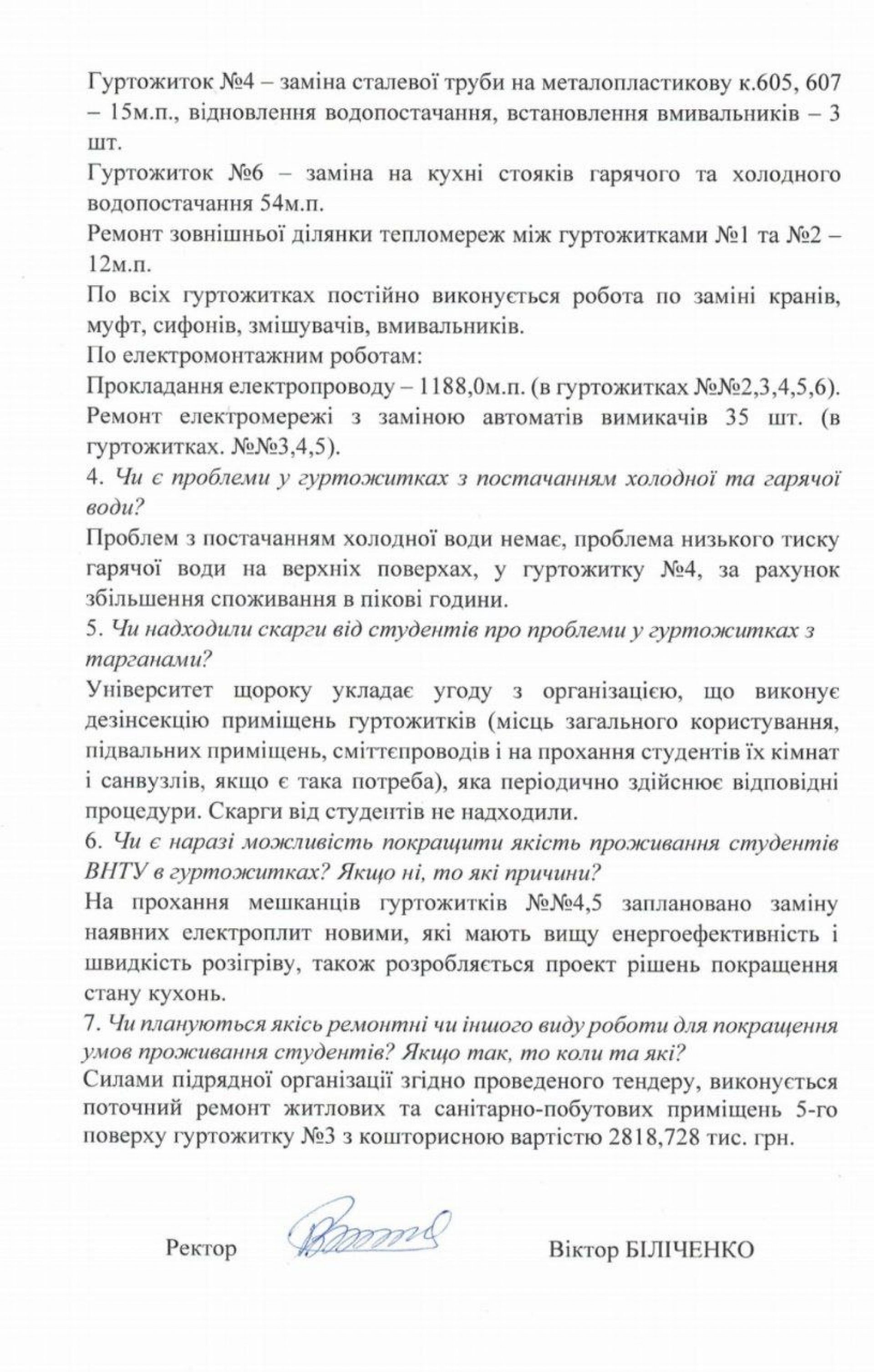 «Санітарні умови — у належному стані. Починаючи з 2014 року, як державному університету, що фінансується з держбюджету, закладу не виділяли коштів на ремонт гуртожитків, закупівлю ліжок, матраців, тумбочок, електроплит тощо. Ремонтні роботи виконуються завдяки тісній співпраці інститутів і факультетів університету зі стейкхолдерами», — зазначено у листі.