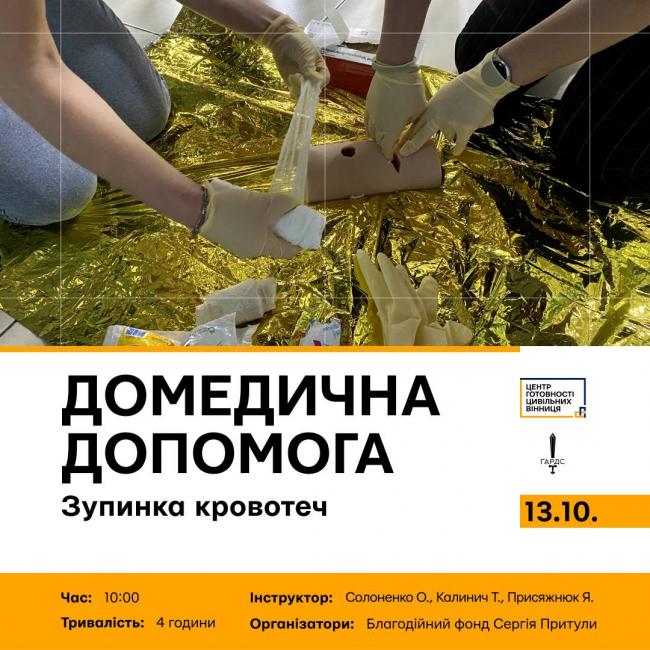- Цієї неділі, 13 жовтня, вінничан запрошують на тренінг «Домедична допомога. Зупинка кровотеч» від Благодійного фонду Сергія Притули та ГО “Ґардс”.