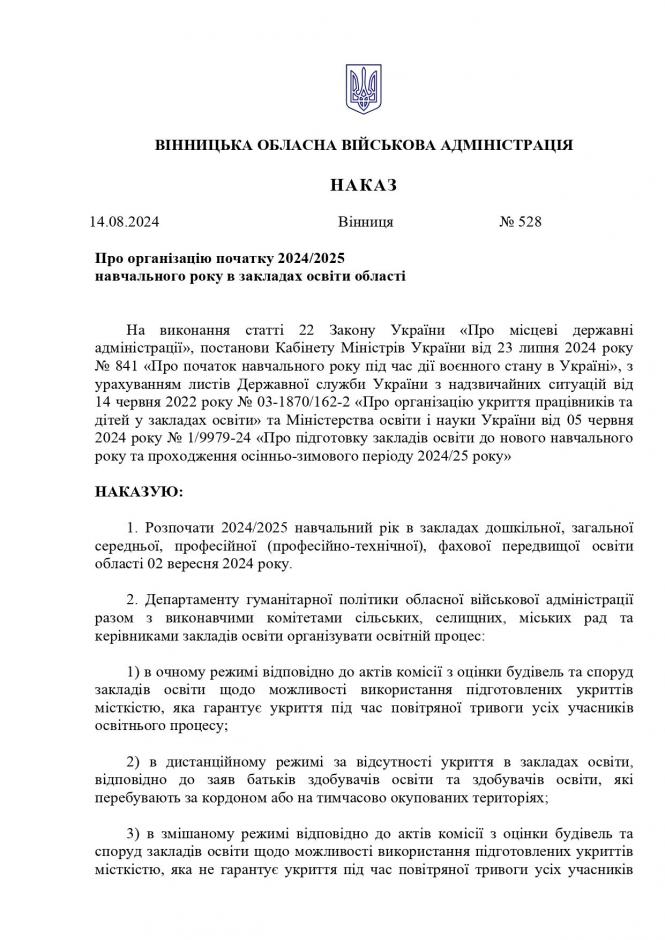 Навчальний рік 2024/2025 в закладах дошкільної, загальної середньої, професійної (професійно-технічної), фахової передвищої освіти області розпочнуть 2 вересня 2024 року. Про це йдеться у Наказі першої заступниці начальника Вінницької обласної військової адміністрації Наталії Заболотної.