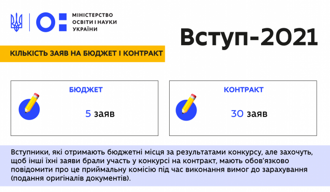 У 2021 році вступники зможуть подати максимум 5 заяв на бюджет, як і минулого року. А от вступників на контракт очікує новація щодо обмеження кількості поданих заяв для вступу на контракт — до 30 заяв включно.