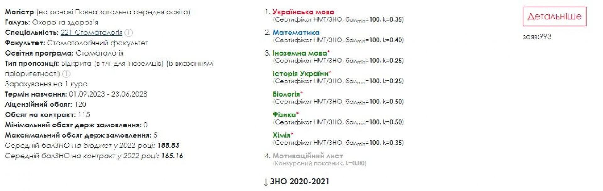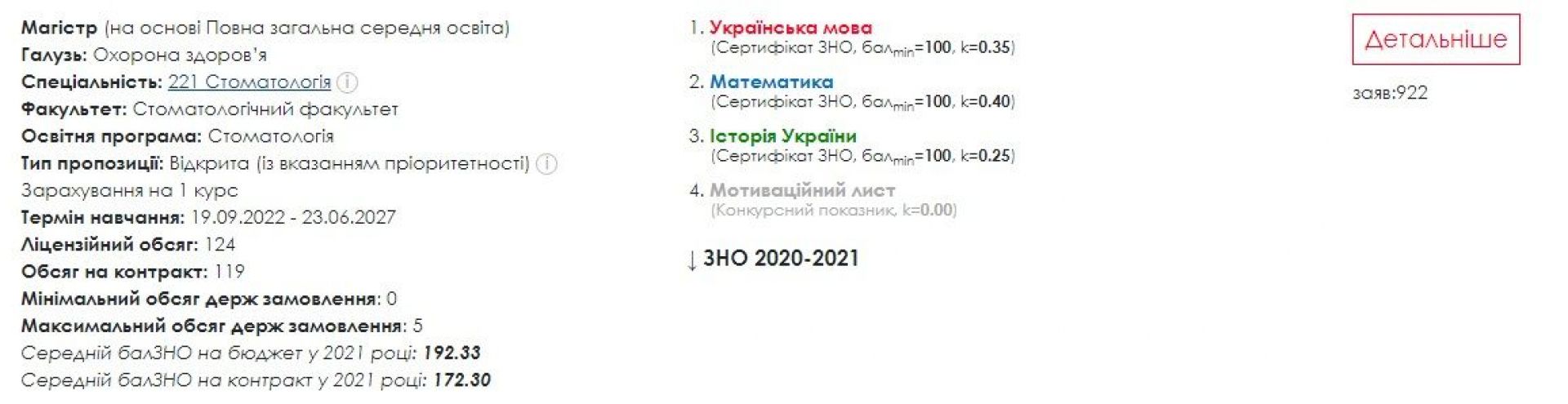 У 2022 році перші дві, а саме «Медицина» ― 2634 та «Стоматологія» ― 922, теж були провідними спеціальностями, от замість місце «Психології» займала «Педіатрія» ― 315.