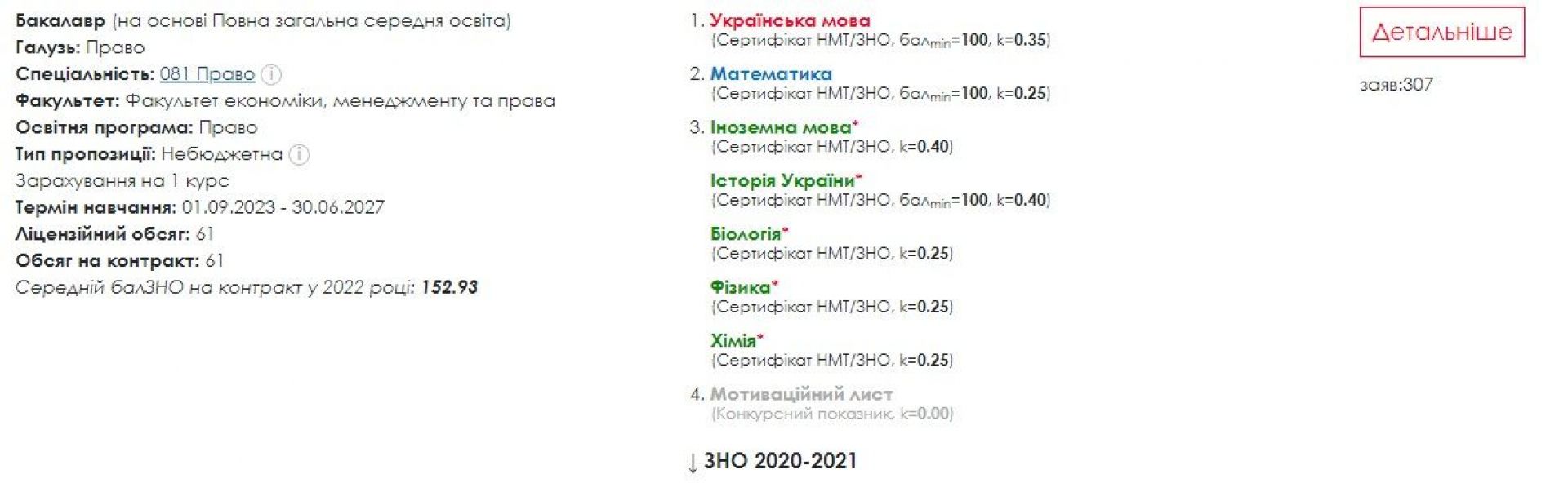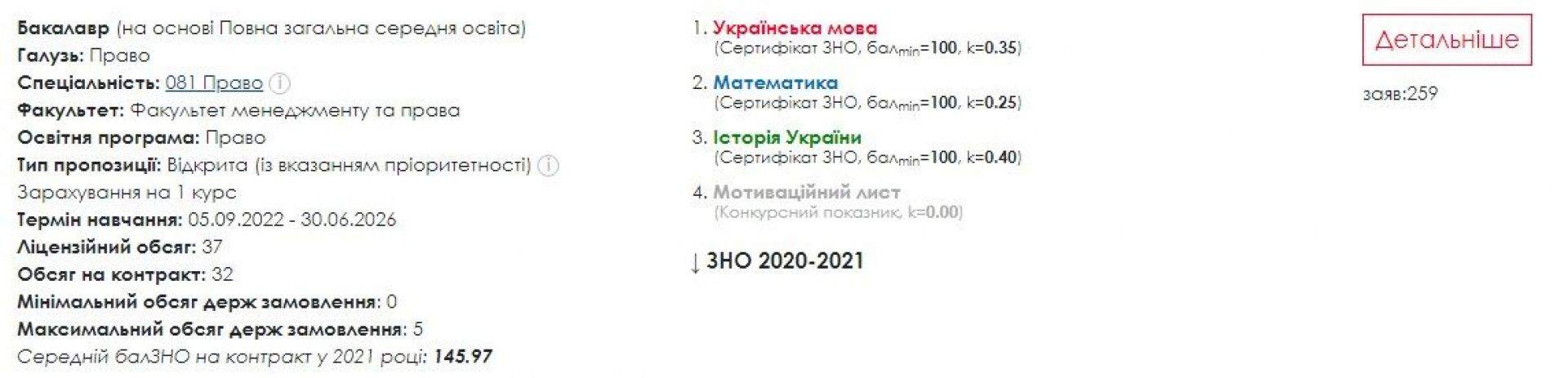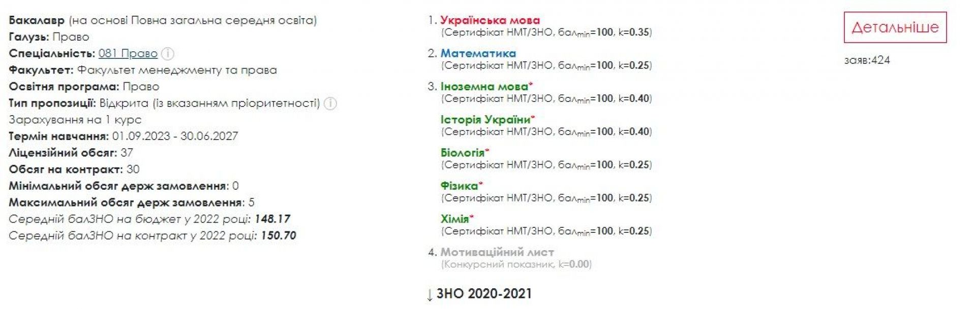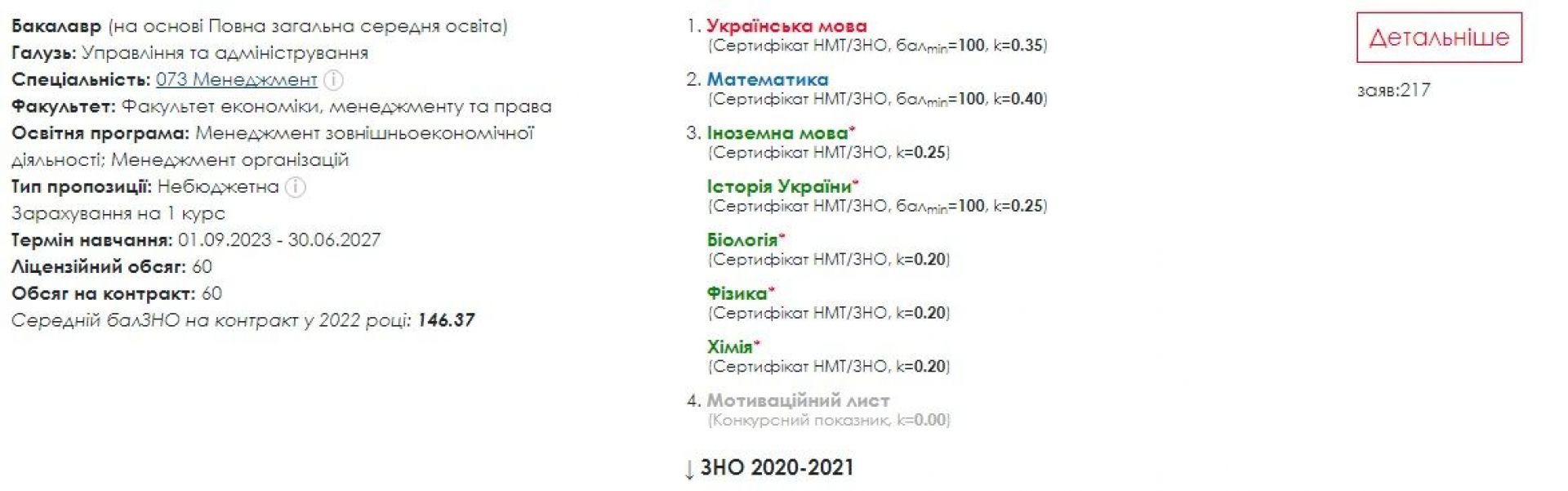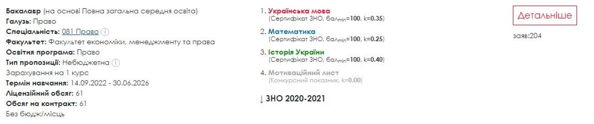 Тут найбільше заяв має спеціальність «Право» ― 307, потім «Менеджмент» ― 217 та «Маркетинг» ― 208 поданих заяв.