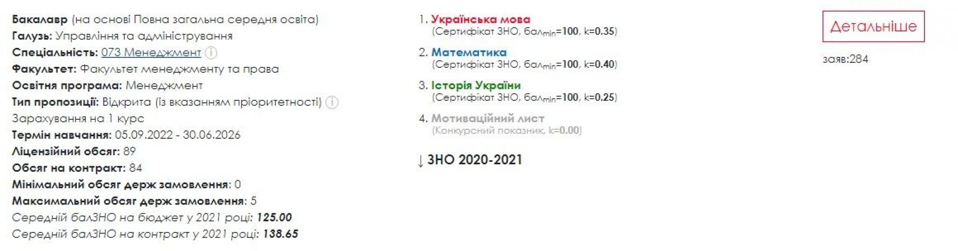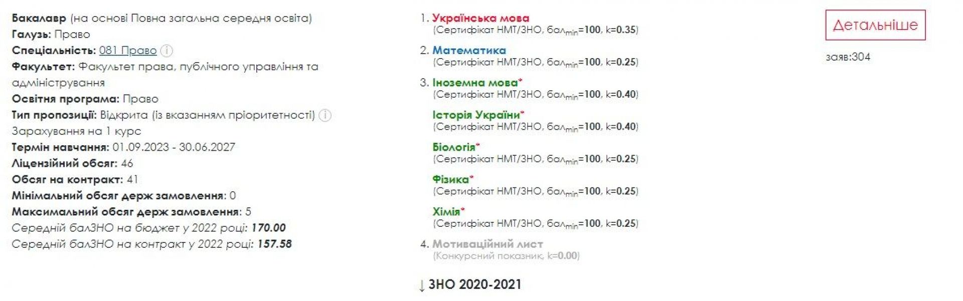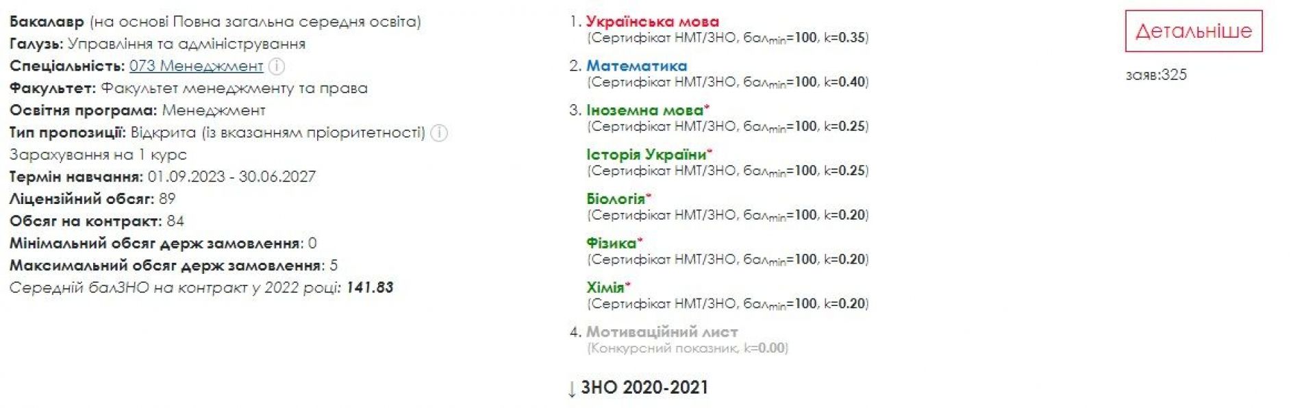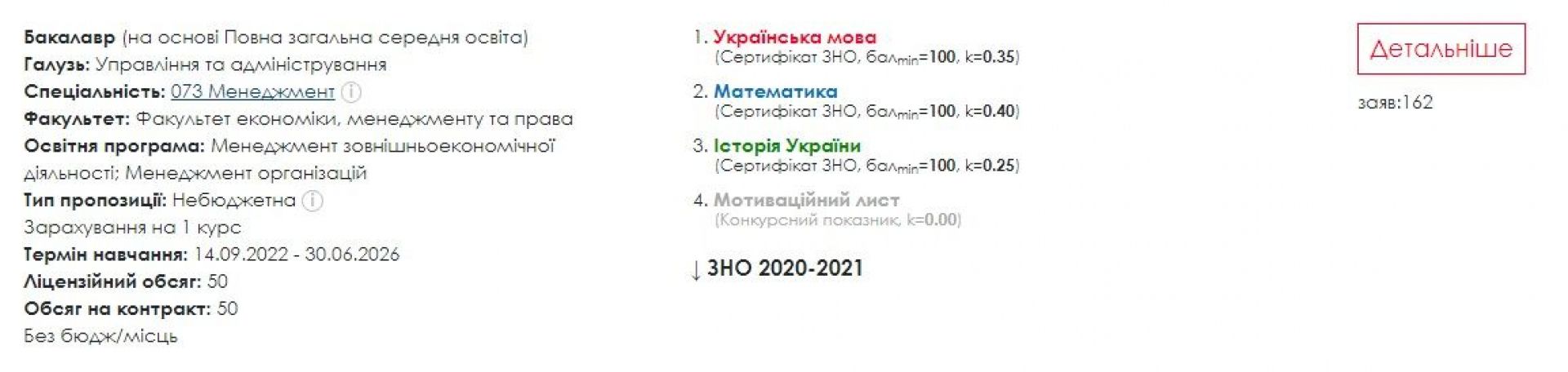 Тут найбільше заяв має спеціальність «Право» ― 307, потім «Менеджмент» ― 217 та «Маркетинг» ― 208 поданих заяв.