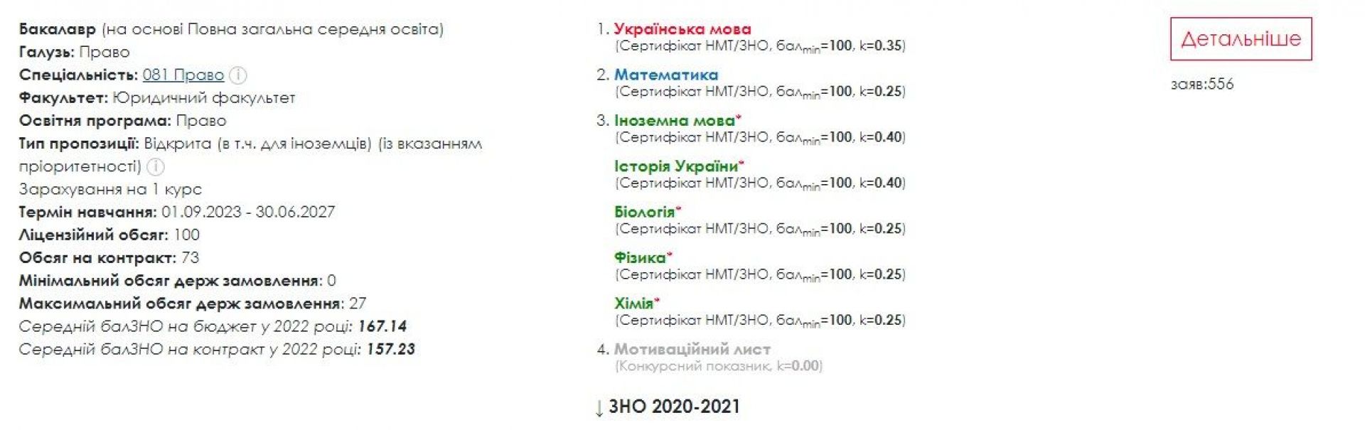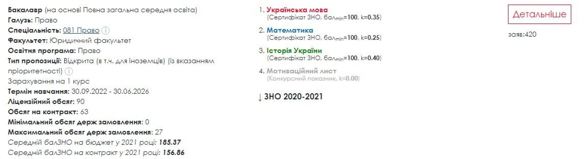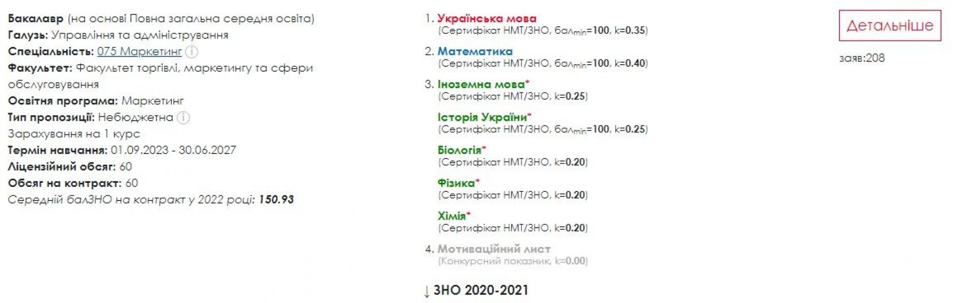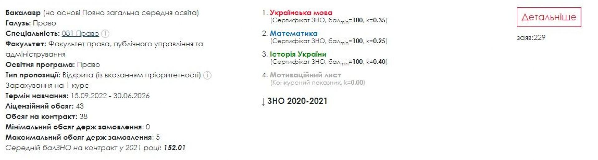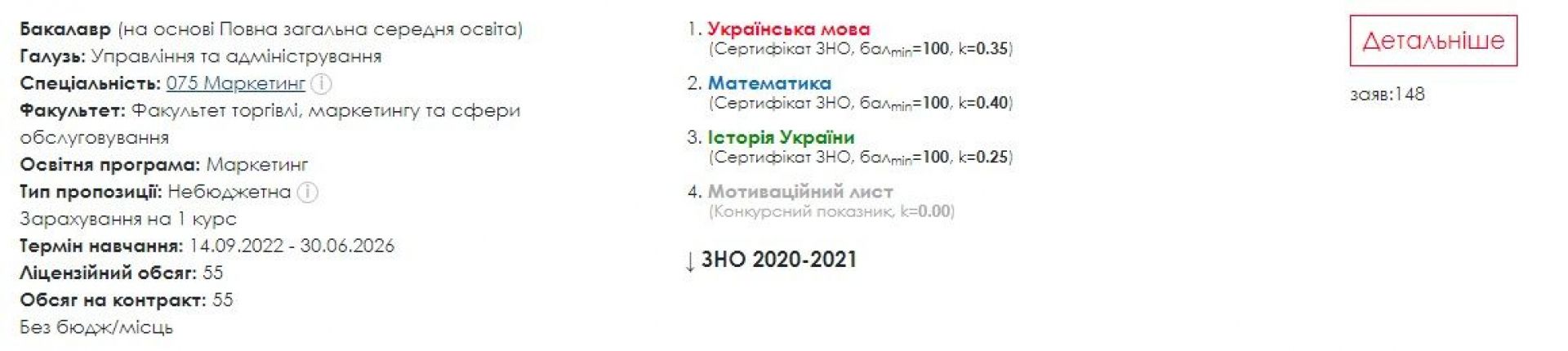 Тут найбільше заяв має спеціальність «Право» ― 307, потім «Менеджмент» ― 217 та «Маркетинг» ― 208 поданих заяв.
