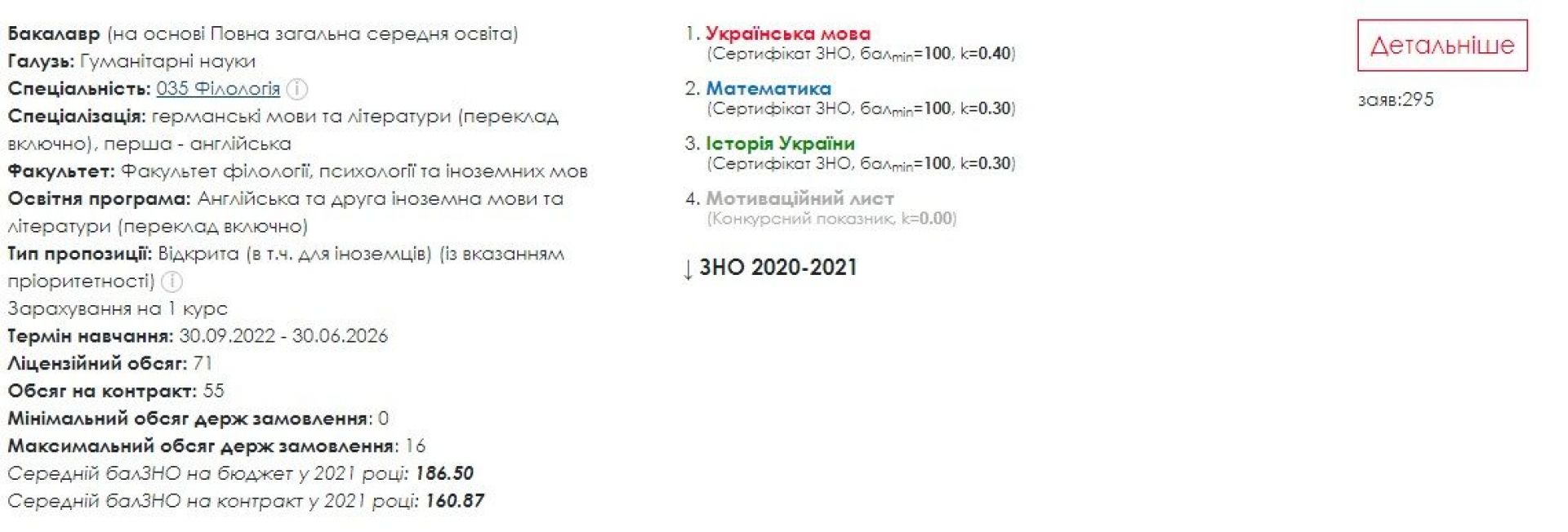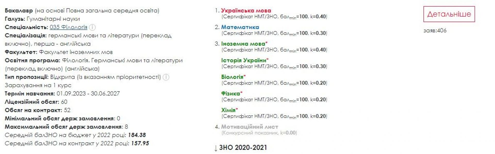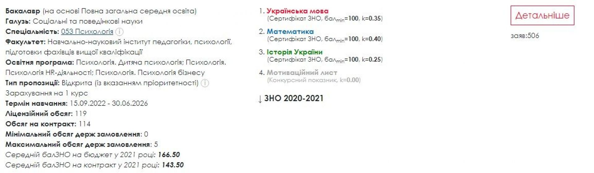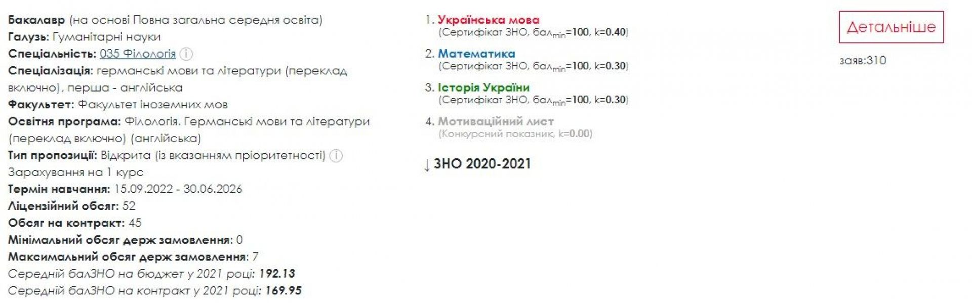 Тут найбільше заяв має спеціальність «Право» ― 307, потім «Менеджмент» ― 217 та «Маркетинг» ― 208 поданих заяв.
