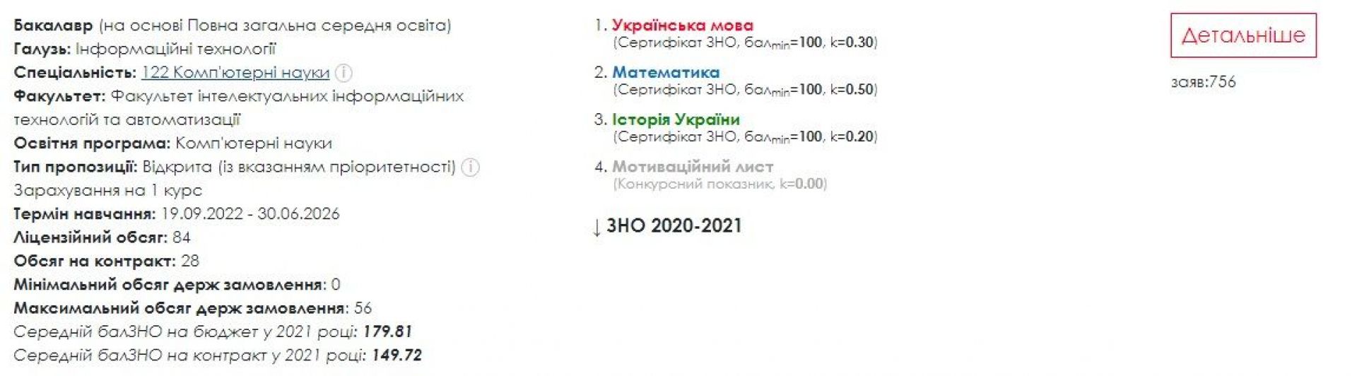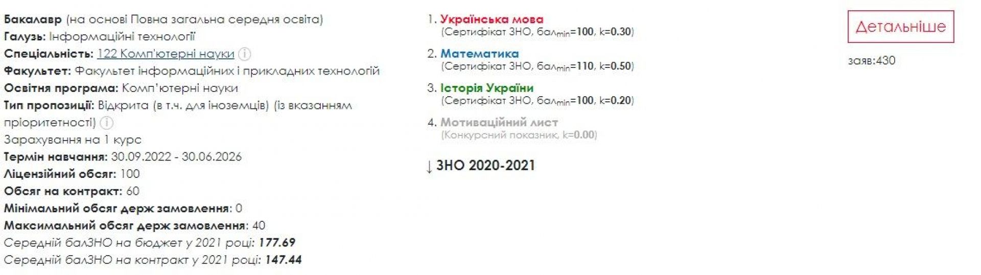 Найбільше заявок подали на спеціальність «Право»: 556. Наступною цікавою для вступників виявилась спеціальність «Комп’ютерні науки» ― 401 заява. І ще однією досить популярною серед цьогорічних абітурієнтів є «Психологію», туди подали 368 заяв.