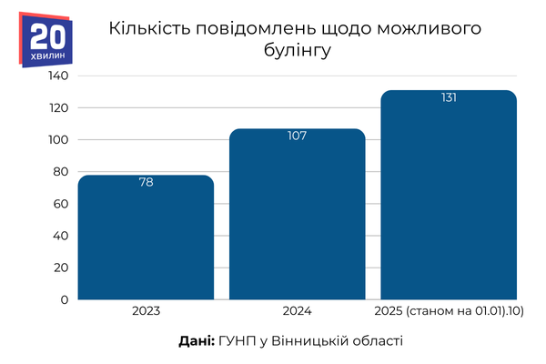 Так, у період з 2023 по 2025 роки до поліції Вінницької області надійшло 316 повідомлень щодо можливого вчинення булінгу стосовно дітей у закладах освіти, з них: 78 — у 2023 році, 107 — у 2024 році, 131 — у 2025 році.