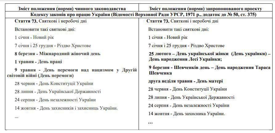 Законопроєктом пропонується внести зміни до статті 73 Кодексу законів про працю та встановити такі святкові дні: