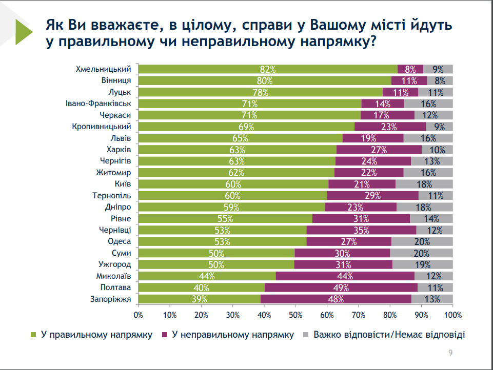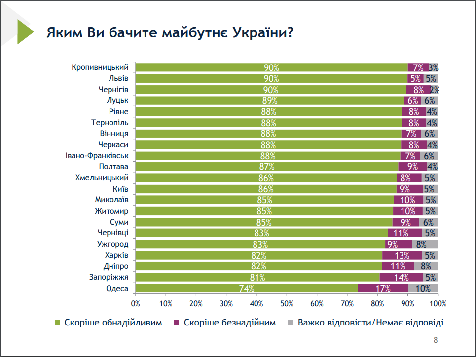 На питання: «Яким ви бачите майбутнє України?» — 88% респондентів з Вінниці відповіли, що обнадійливим, і лише 7% вважають, що воно в країни — скоріше безнадійне. Також 80% містян вважають, що справи у Вінниці йдуть у правильному напрямку, інші 11% — у неправильному.