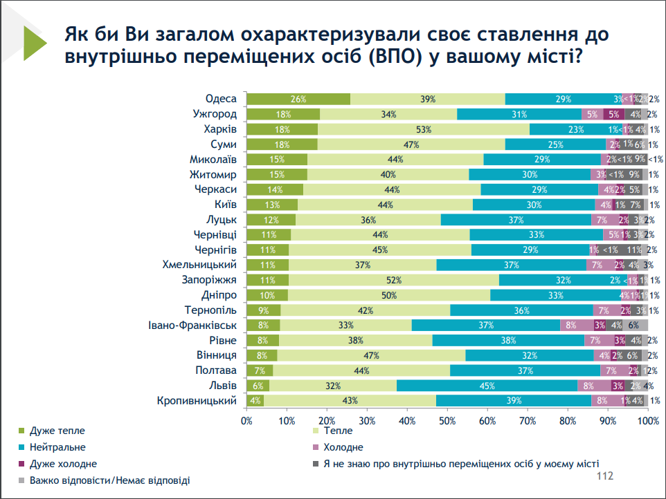 Ставлення до внутрішньо переміщених осіб у вінничан також дуже різниться. Наприклад, лише 8% містян схарактеризувало його, як дуже тепле. Тепле — 47%, нейтральне — 32%, холодне — 4%, дуже холодне — 2%.