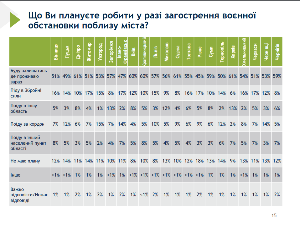 «Що ви плануєте робити у разі загострення воєнної обстановки поблизу міста?» На це питання містяни відповідали так: 51% залишатимуться там, де зараз живуть. 16% планують приєднатися до ЗСУ. 5% поїдуть в іншу область, а 7% — за кордон. Ще 12% вінничани не мають плану дій на такий випадок.