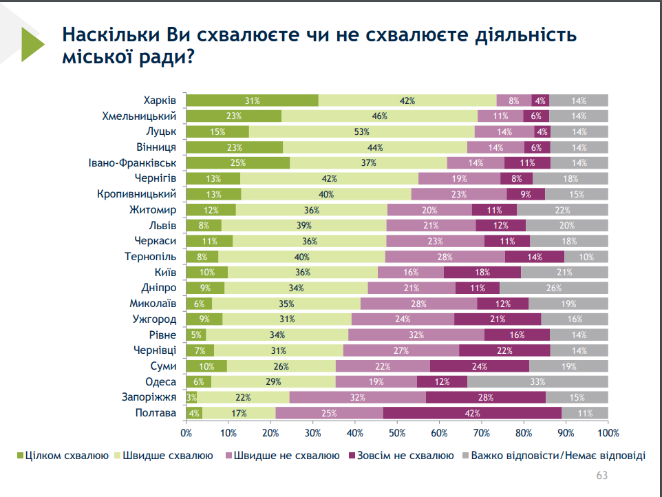 Водночас діяльність Вінницької міської ради схвалює 23% містян, 44% — швидше схвалюють, 14% — швидше не схвалюють, 6% — зовсім не схвалюють. Діяльність міського голови Сергія Моргунова мають майже аналогічні показники.