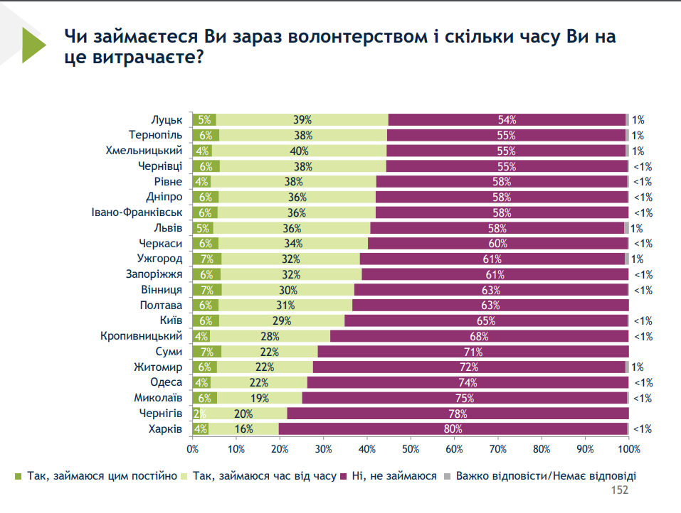 Більшість вінничан не займається волонтерством. Постійно ним займається лише 7% респондентів, 30% займаються ним час від часу, 63% — не займаються зовсім.