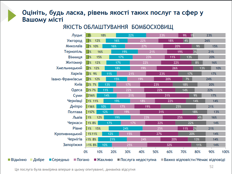 У результатах дослідження можна також дізнатися про рівень задоволеності містян якістю надання комунальних послуг, роботою громадського транспорту, медичних та останніх закладів, поліції, стану доріг, вуличного освітлення тощо. Зокрема, на питання про якість облаштування «бомбосховищ» вінничани давали такі відповіді: 2% — відмінно, 15% — добре, 17% — середньо, 23% — погано, 11% — жахливо, 13% — послуга недоступна.