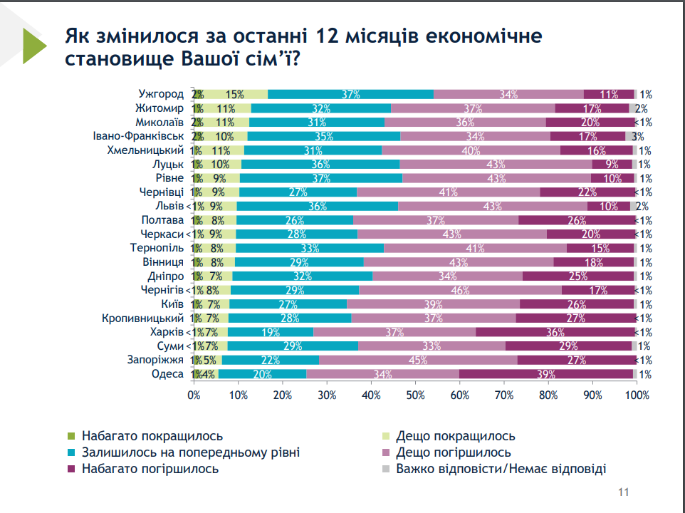 Відповідаючи на питання про зміни в економічному становищі власних родин впродовж останнього року, вінничани дали наступні відповіді: 43% — дещо погіршилося, 29% — залишилося на попередньому рівні, 18% — набагато погіршилося, 8% — дещо покращилося, 1% — набагато покращилося.