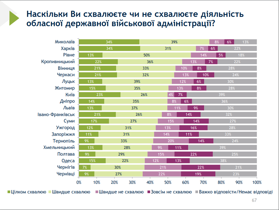 Було в дослідженні питання й про діяльність Вінницької обласної військової адміністрації. Результати наступні: 21% опитаних цілком схвалює, 33% — швидше схвалює, 10% — швидше не схвалюють, 8% — зовсім не схвалюють.