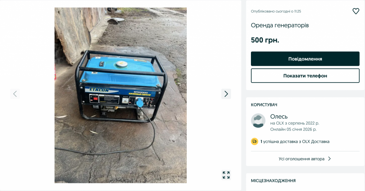 — Найчастіше у нас беруть генератори на 5-7 кіловат для приватних будинків. Людям важливо мати світло, тепло і щоб працював холодильник. Бронюють одразу на кілька діб, бо ніхто не знає, як довго триватимуть відключення, — розповів власник одного з оголошень.