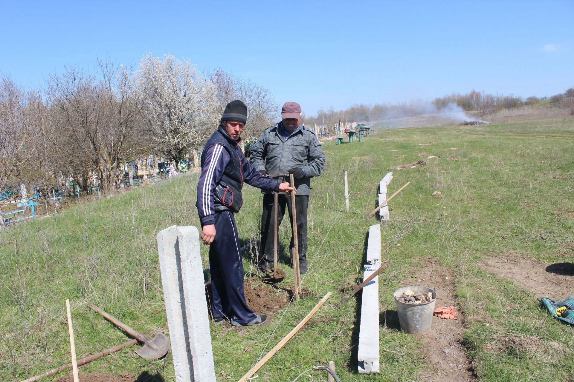 За якихось п’ятнадцять хвилин по битому шляху машина звертає на грунтівку, що веде до кладовища.Там робочі якраз встановлюють бетонний паркан навколо цвинтаря.