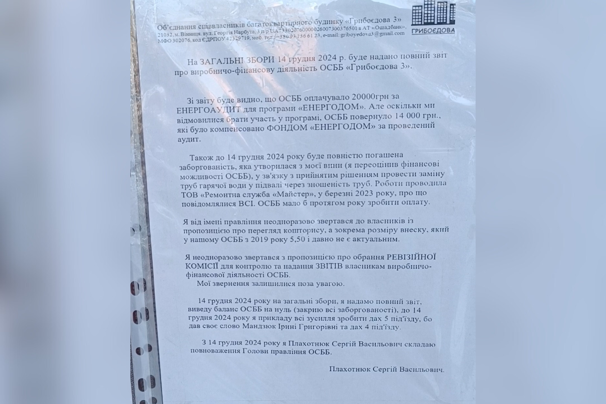14 грудня 2024-го головою ОСББ були ініційовані збори. На них він мав прозвітувати про стан справ, і також збирався скласти повноваження. Люди зібралися, прийшли двоє членів правління ОСББ. А от Сергія Плахотнюка на цих зборах не було.