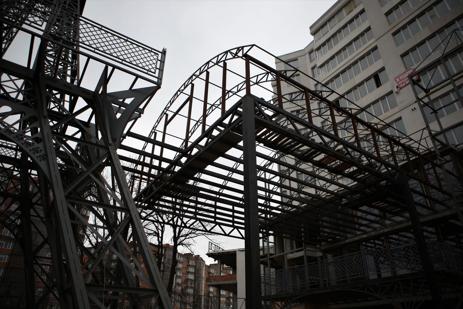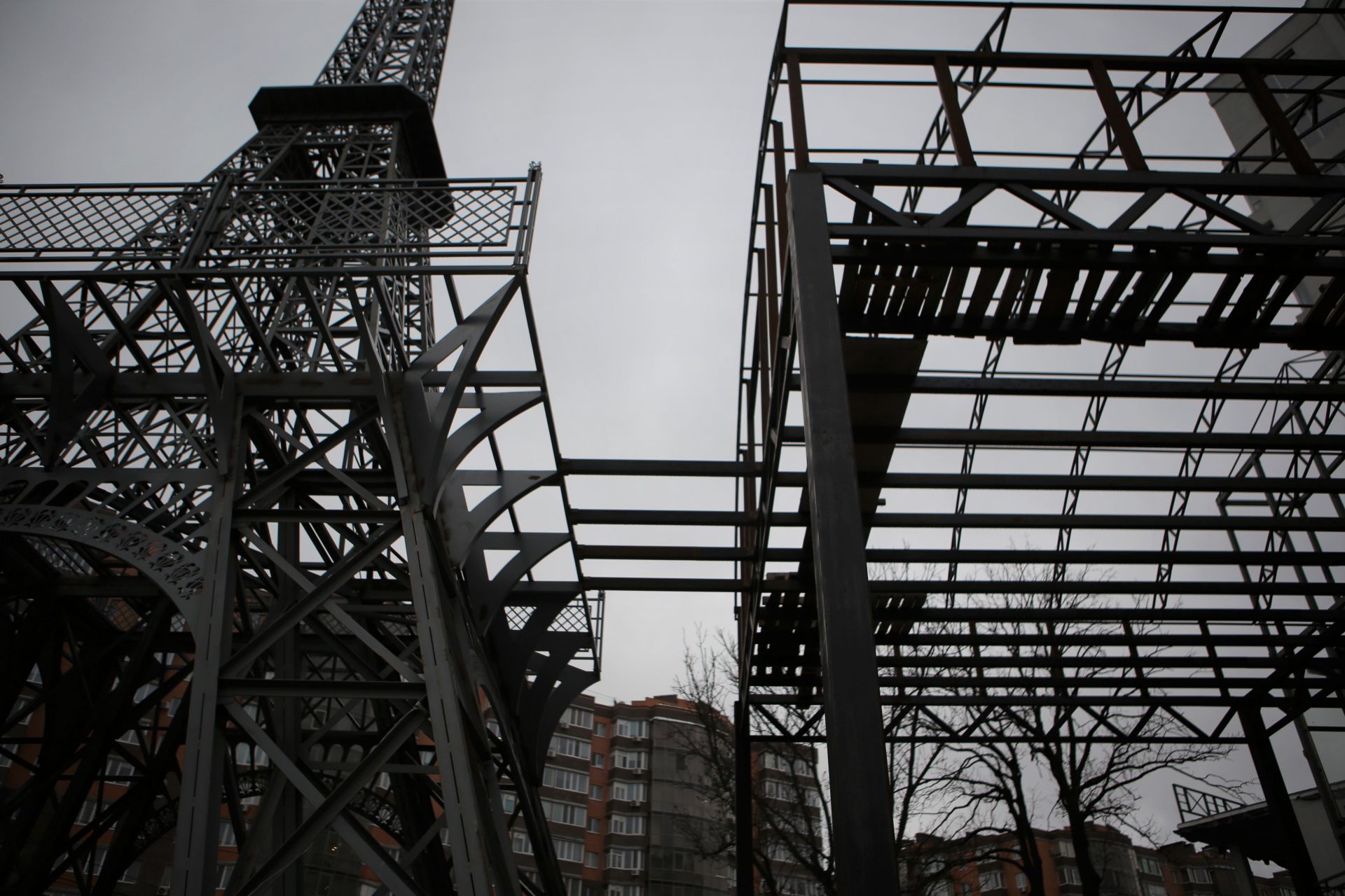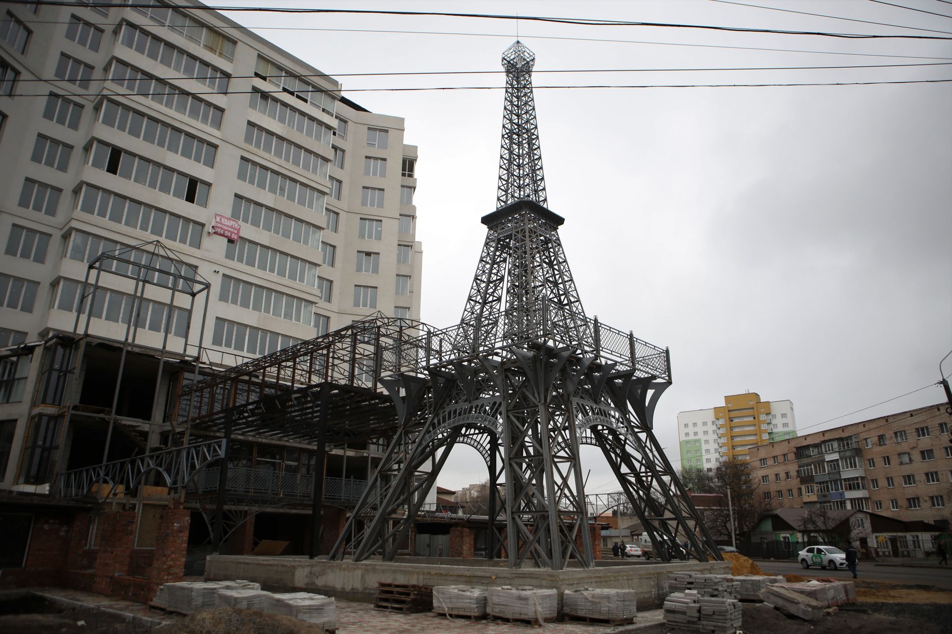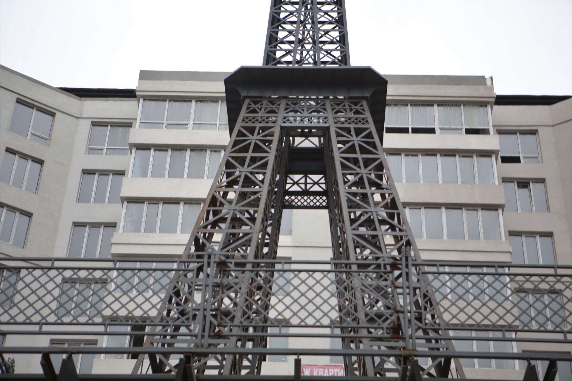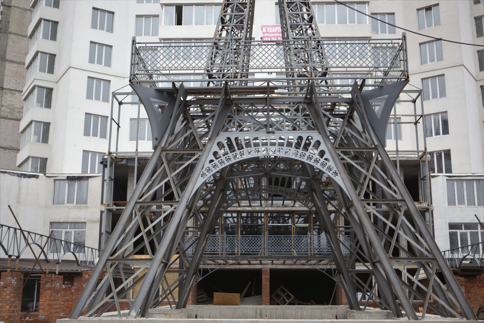 У будь-якому разі — «Ейфелева вежа» вже стоїть зведеною. Наразі видно, що другу частину конструкції об’єднали з верандою багатоповерхівки. Вочевидь, в майбутньому ця веранда відноситиметься до якогось ресторану, звідки всі охочі зможуть перейти і сфотографуватися прямо біля вежі.