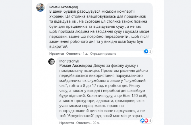 «Проектом рішення дійсно передбачається використання паркувального майданчика як службового лише у «службовий час», тобто з 8 до 17 години у робочі дні. Решту часу, а також у вихідні і неробочі дні шлагбаум буде піднятий. Колектив суду, а це біля 120 осіб, а також прокурори, адвокати, громадяни, які є учасниками справ, мають право на впорядковане й цивілізоване паркування, а не той «броунівський» рух, який має місце зараз», — написав суддя.