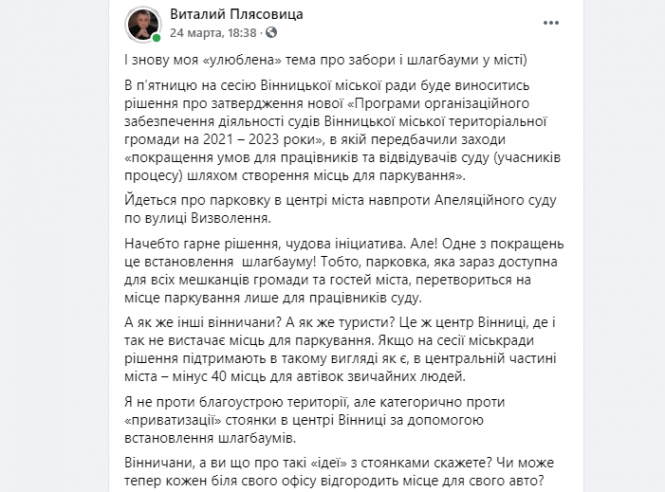 «Парковка, яка зараз доступна для всіх мешканців громади та гостей міста, (через установку шлагбаума - авт.) перетвориться на місце паркування лише для працівників суду. А як же інші вінничани, туристи? Це ж центр Вінниці, де і так не вистачає місць для паркування. Я не проти благоустрою території, але категорично проти «приватизації» стоянки в центрі Вінниці за допомогою встановлення шлагбаумів», — писав Плясовиця на своїй фейсбук-сторінці.