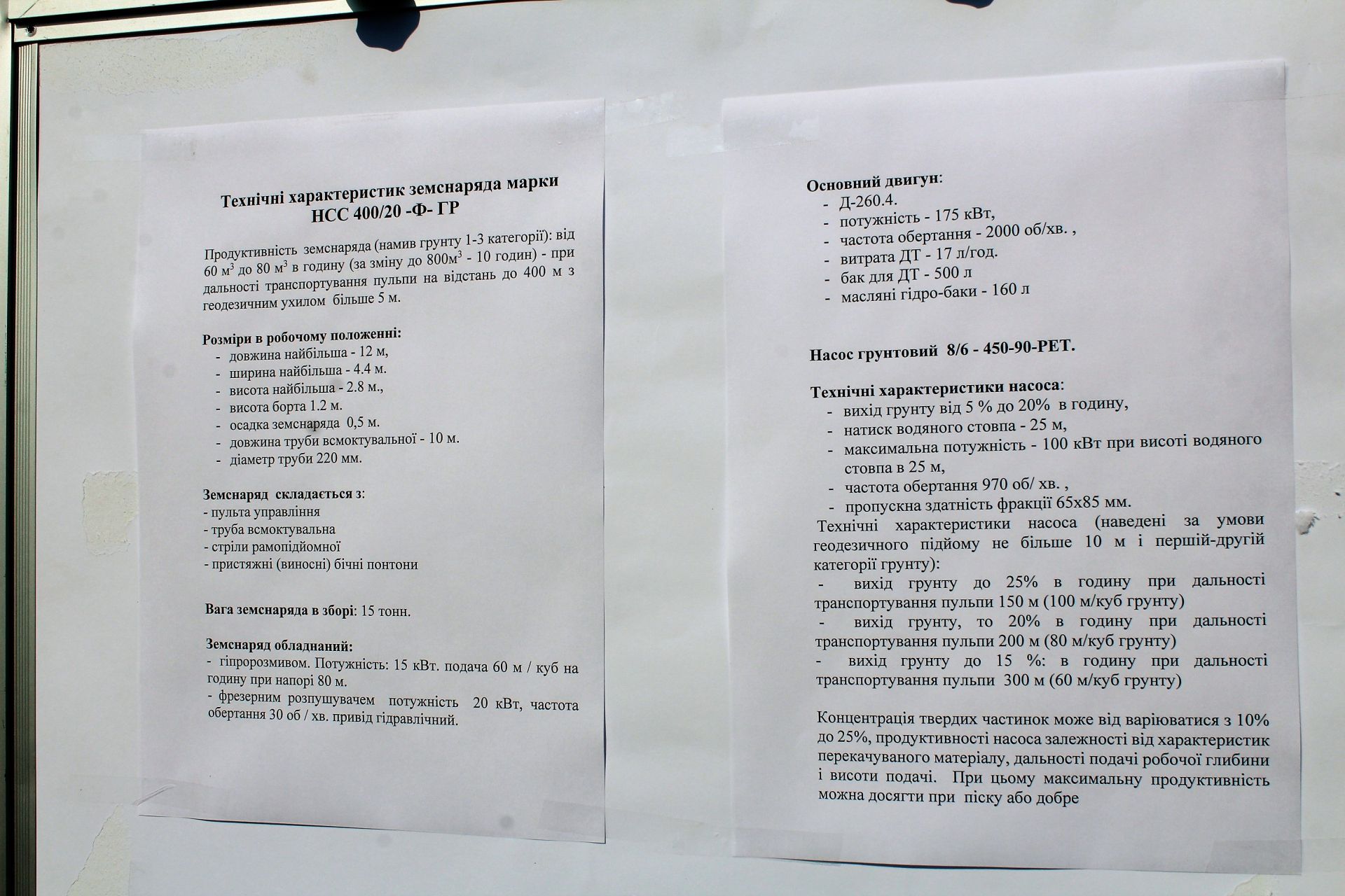 — Цей земснаряд вітчизняного виробництва з Херсону. Марка НСС 400/20-Ф-ГР. Тільки за тестовий період роботи, коли проводилася наладка пристроїв, машина вже відкачала 640 кубометрів намулу з дна річки. Надалі збільшимо потужність та плануємо вийти на показник 800 м³ пульпи (з яких 200 м³ буде намул, а все інше вода - авт.) за добу, — сказав Ніценко.