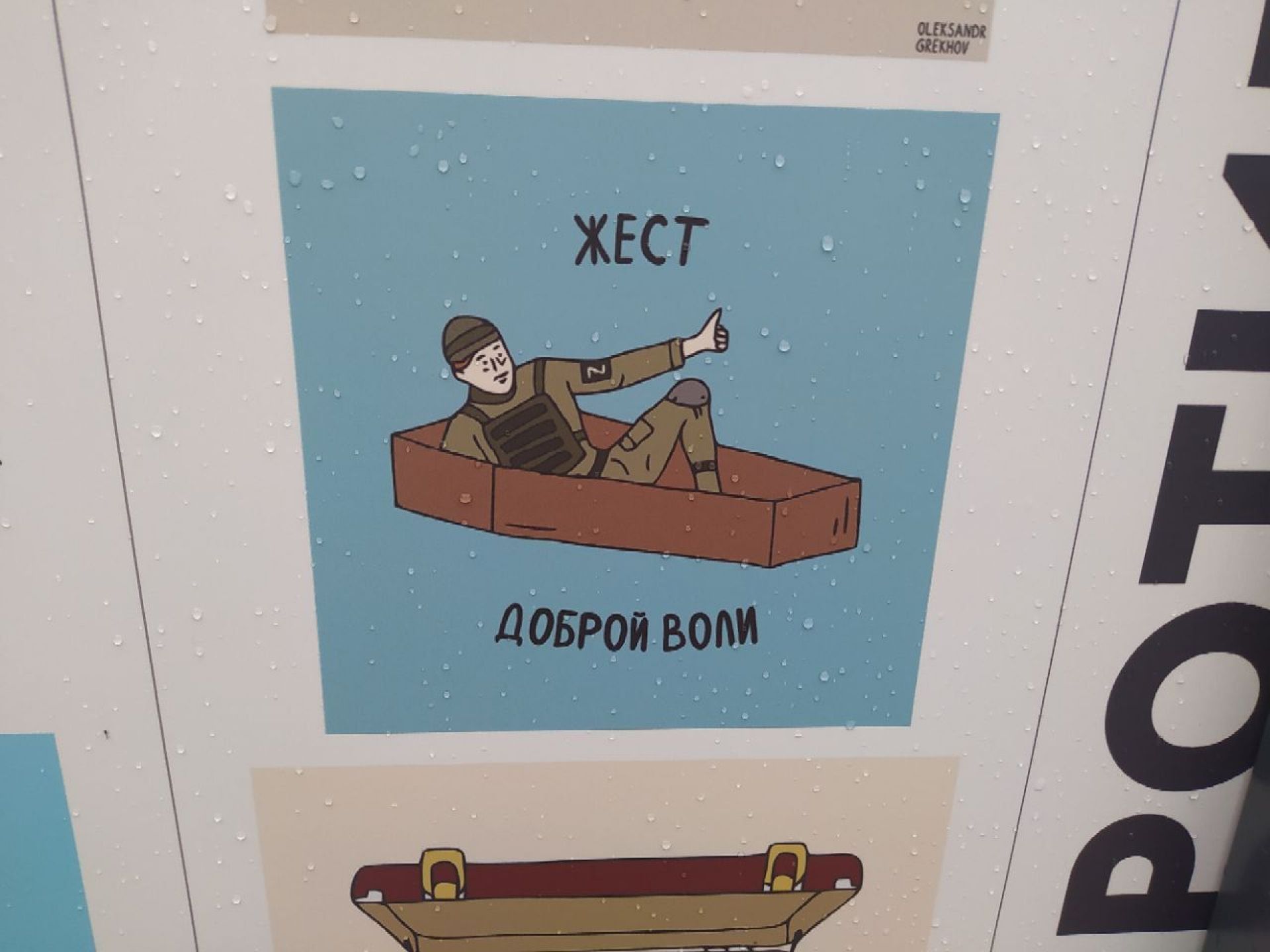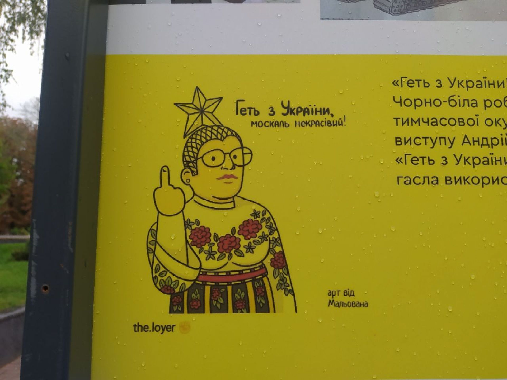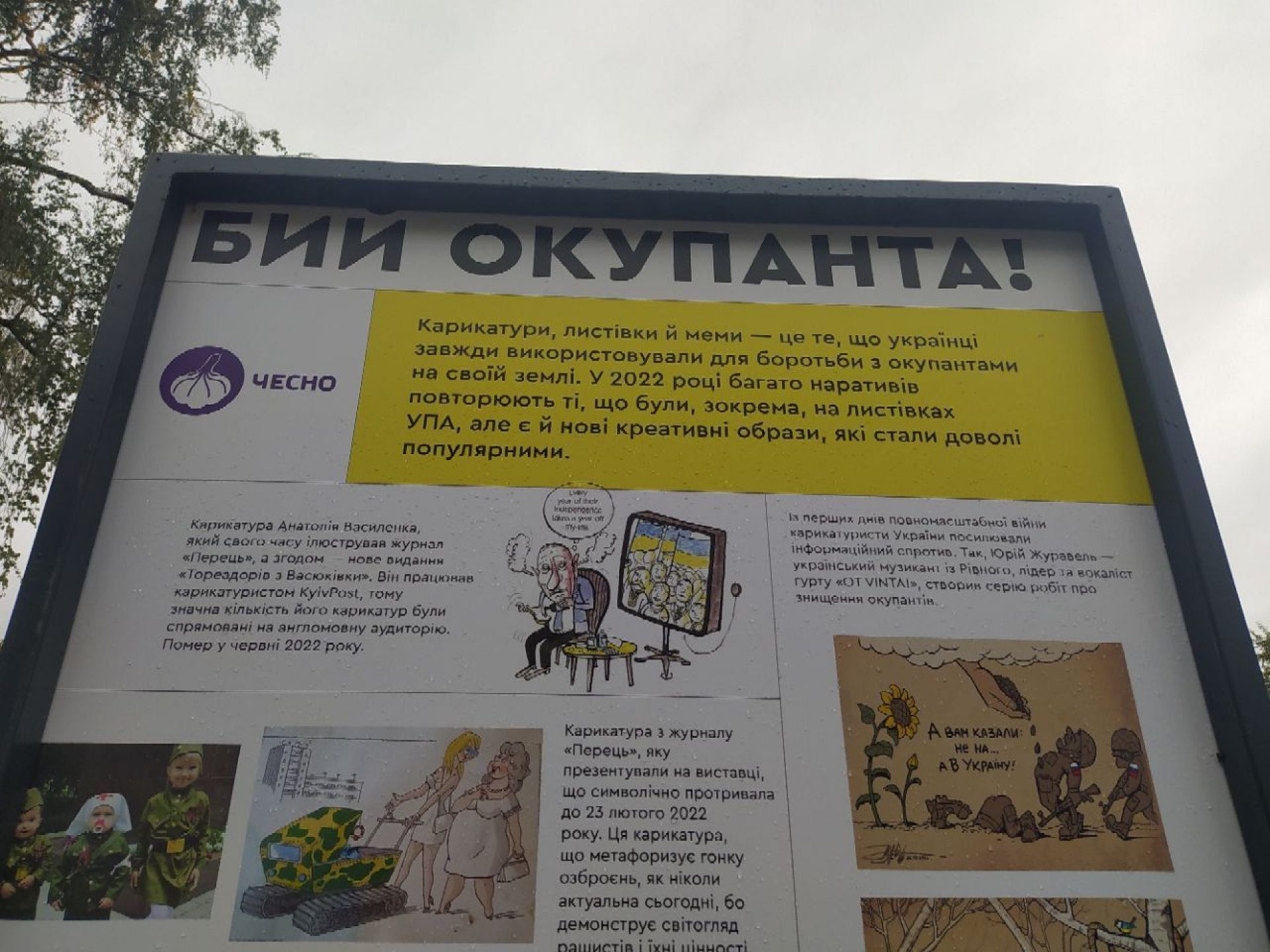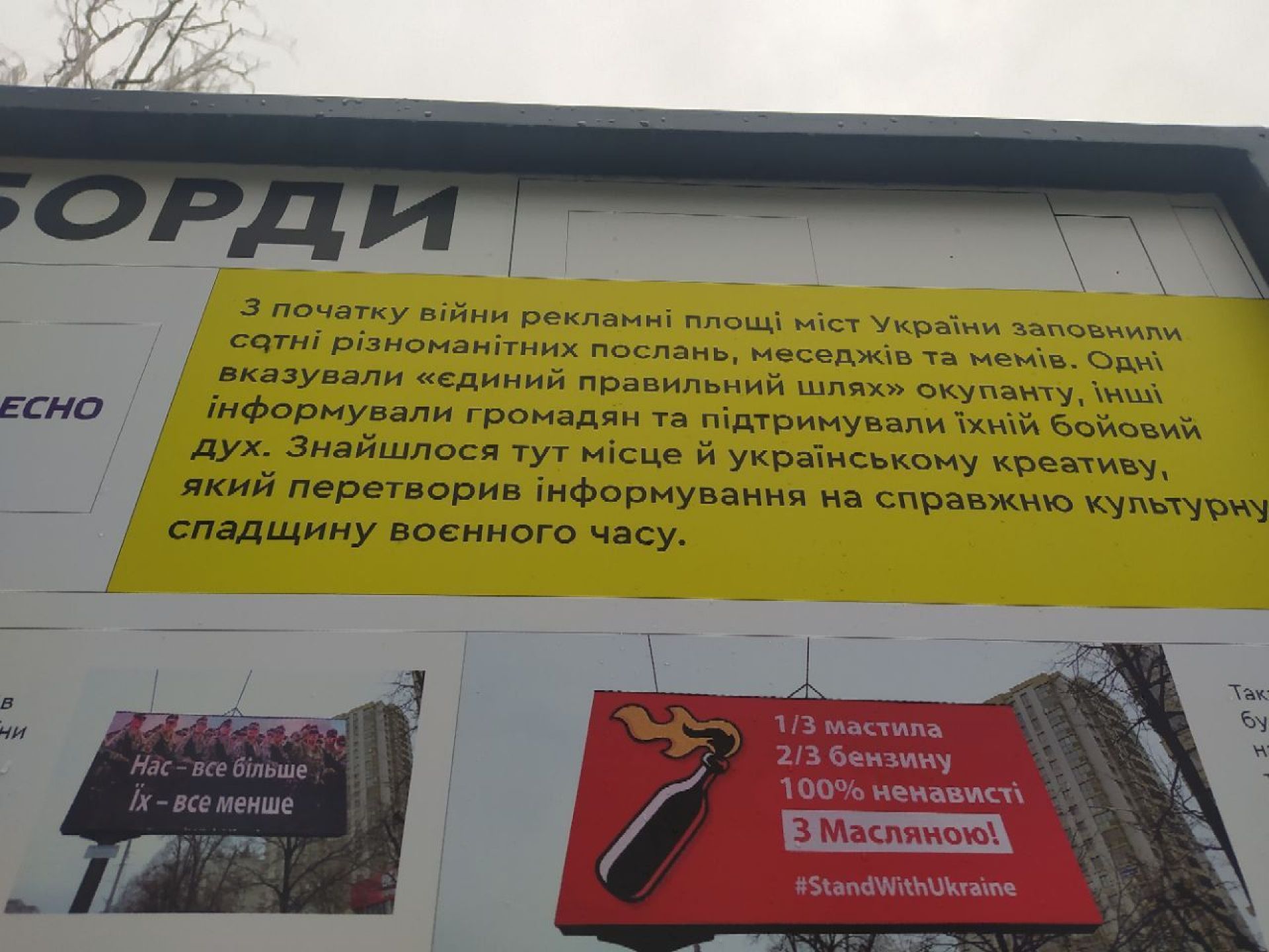У межах виставки представлені борди, мурали, листівки, поштові марки і навіть пісні. Стенд з назвою «Бий окупанта» ілюструє про те, як крилаті фрази цієї війни перетворювалися в популярні меми — один зі способів боротьби українців з окупантом. Тут є і картинки про «семечки в кишенях», і «Геть з України москаль некрасивий» та навіть вислів «жест доброї волі», який українці розуміють по-інакшому, аніж росіяни.