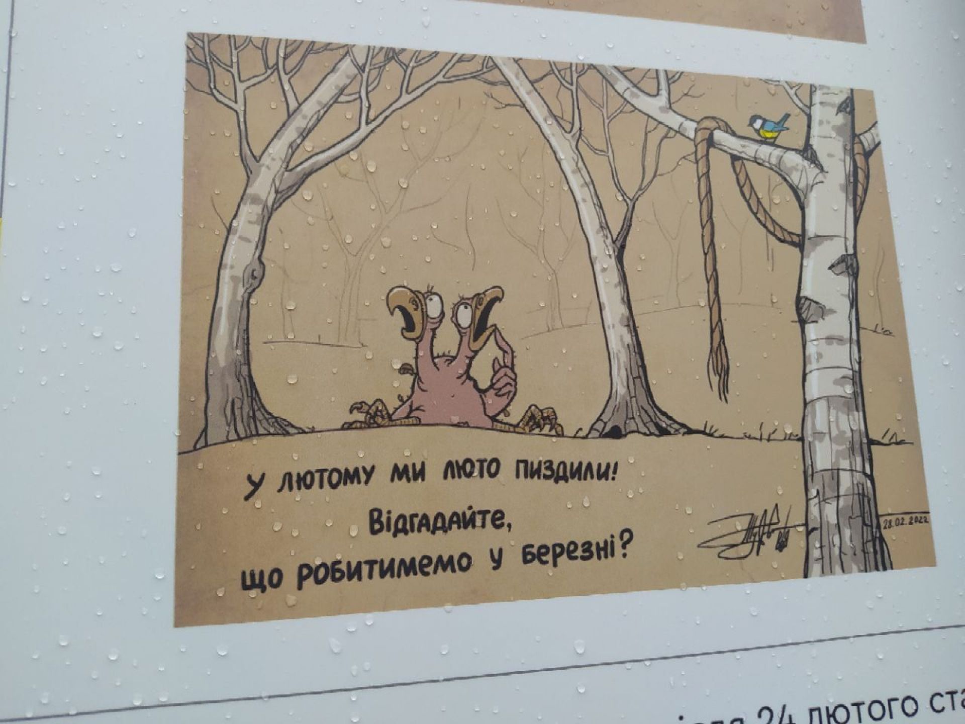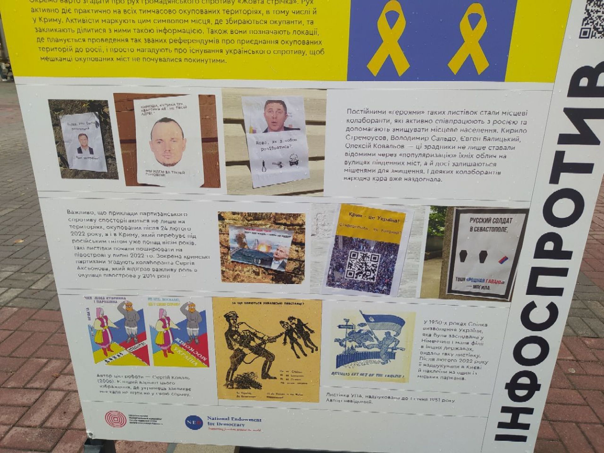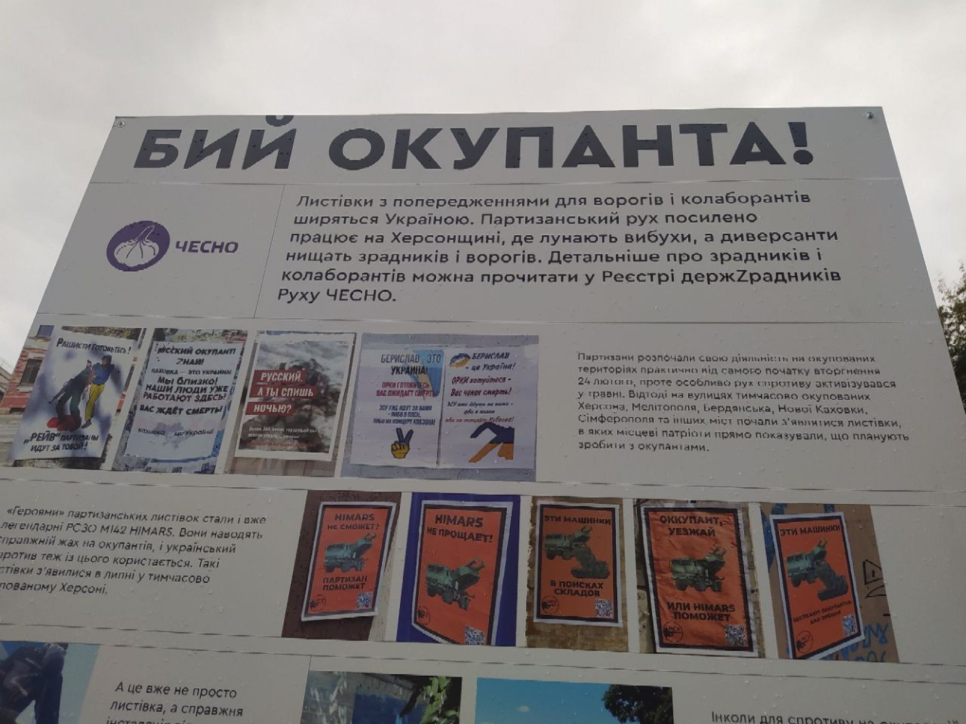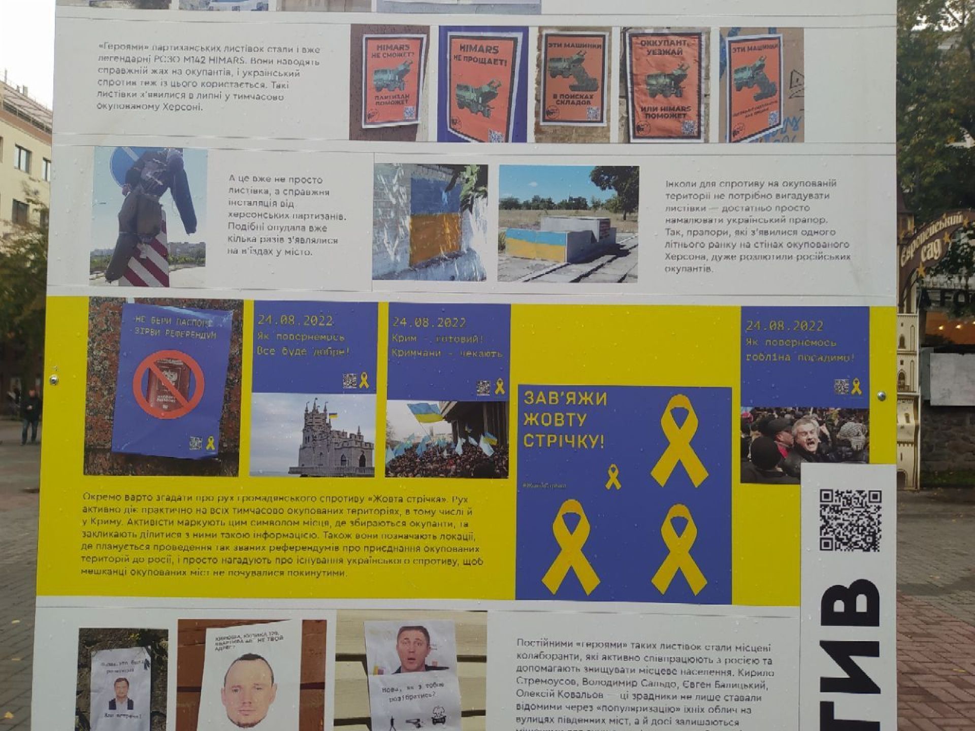 А з іншого боку цього стенду — фото листівок, які розповсюджували українські партизани на окупованій Херсонщині. Там постійними «героями» таких листівок є місцеві колаборанти, такі як Стремоусов, Сальдо та інші люди, які активно співпрацюють з росією.