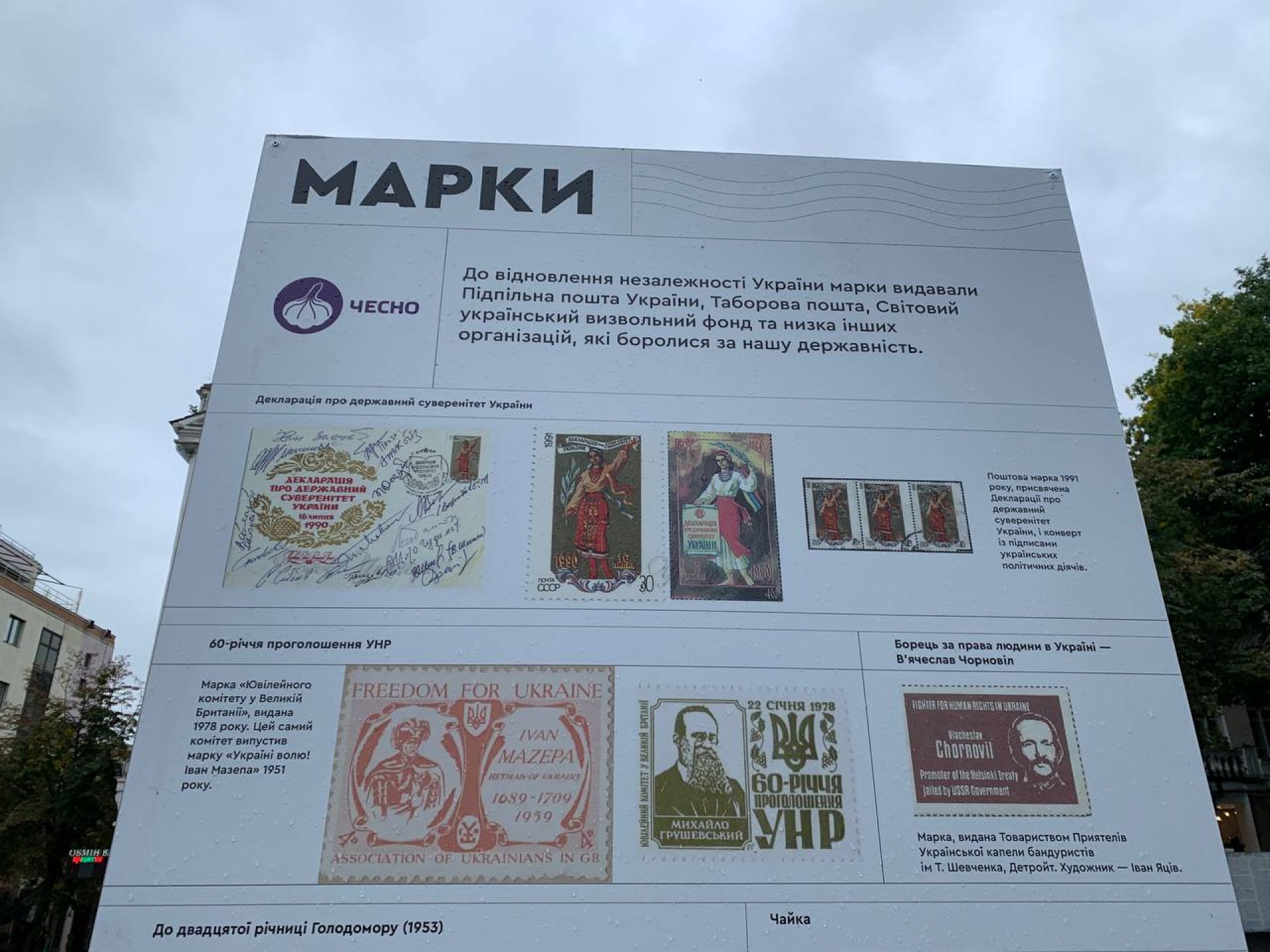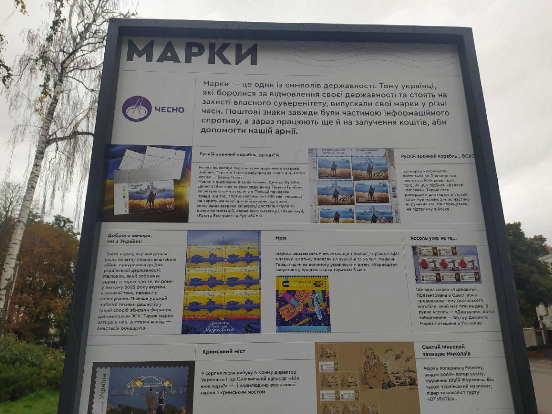 На стендах просто неба Рух ЧЕСНО у співпраці з Національним музеєм Революції Гідності зібрав найбільш промовисті приклади опору українців російським окупантам, які заполонили інфопростір у перші місяці повномасштабного вторгнення.