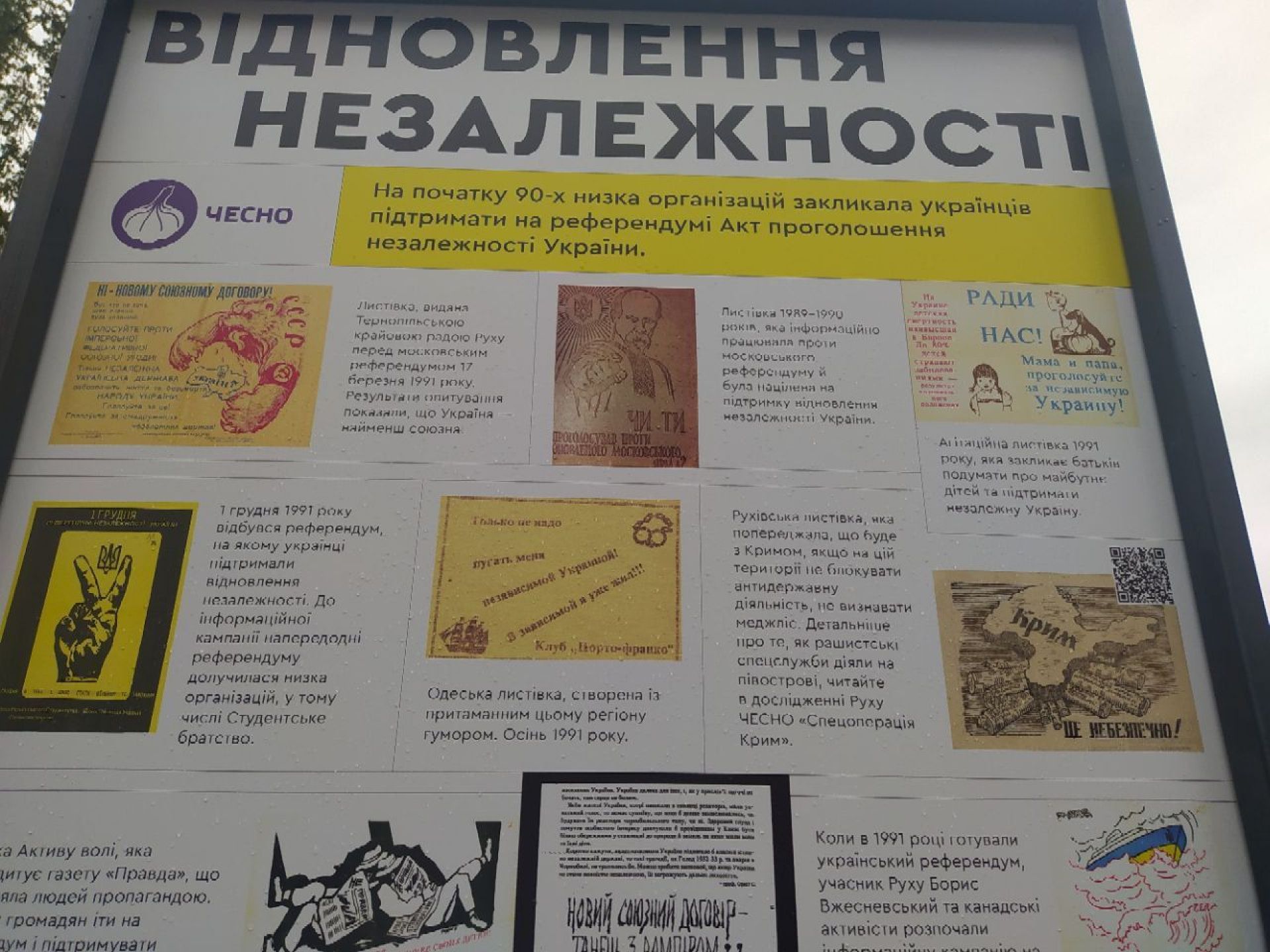 Відновлення Незалежності — стенд, який розміщений поряд з «Бий окупанта». Тут зібрали популярні ілюстрації періоду 90-х років, коли низка організацій закликала людей прийти на референдум та підтримати Акт проголошення Незалежності України.