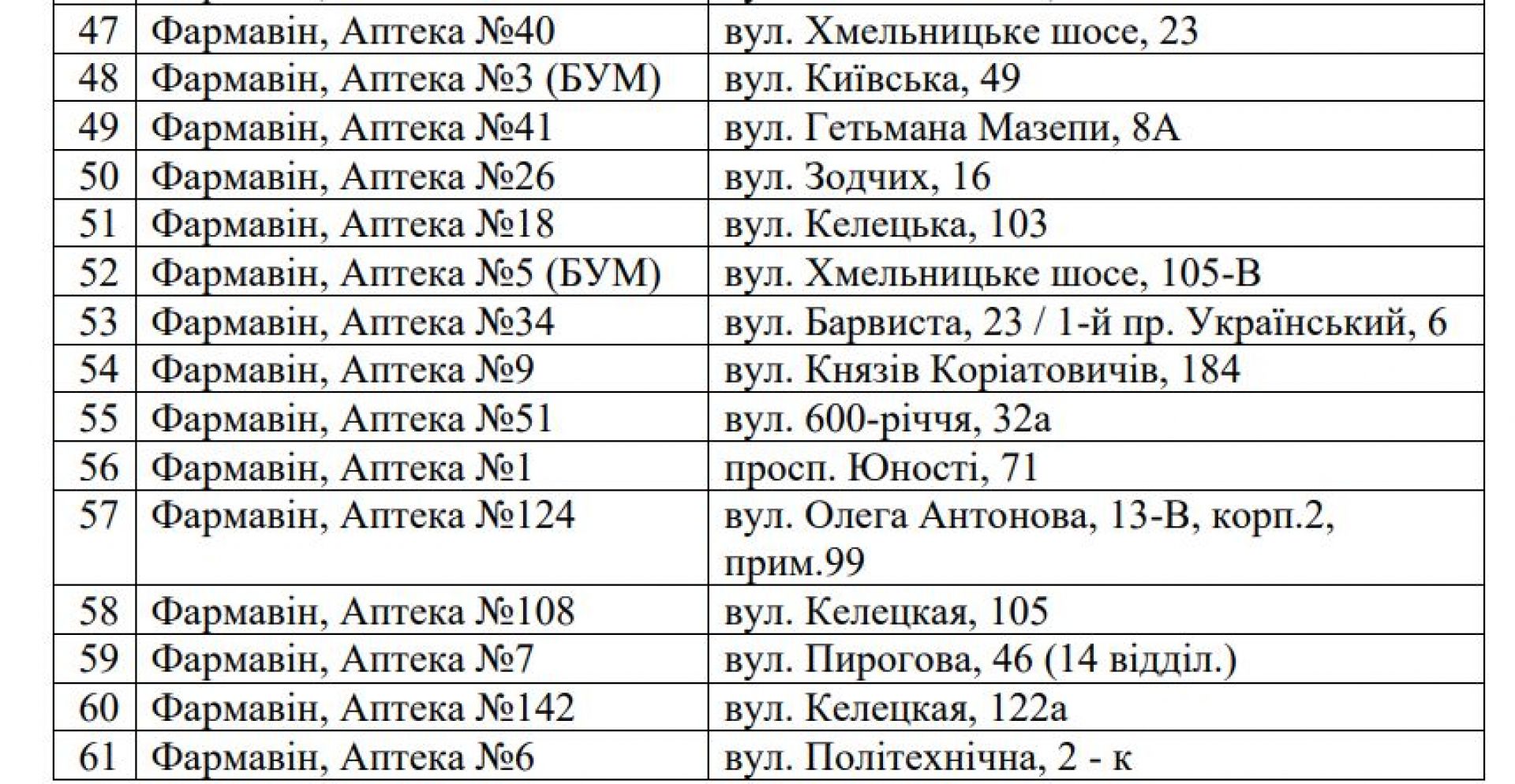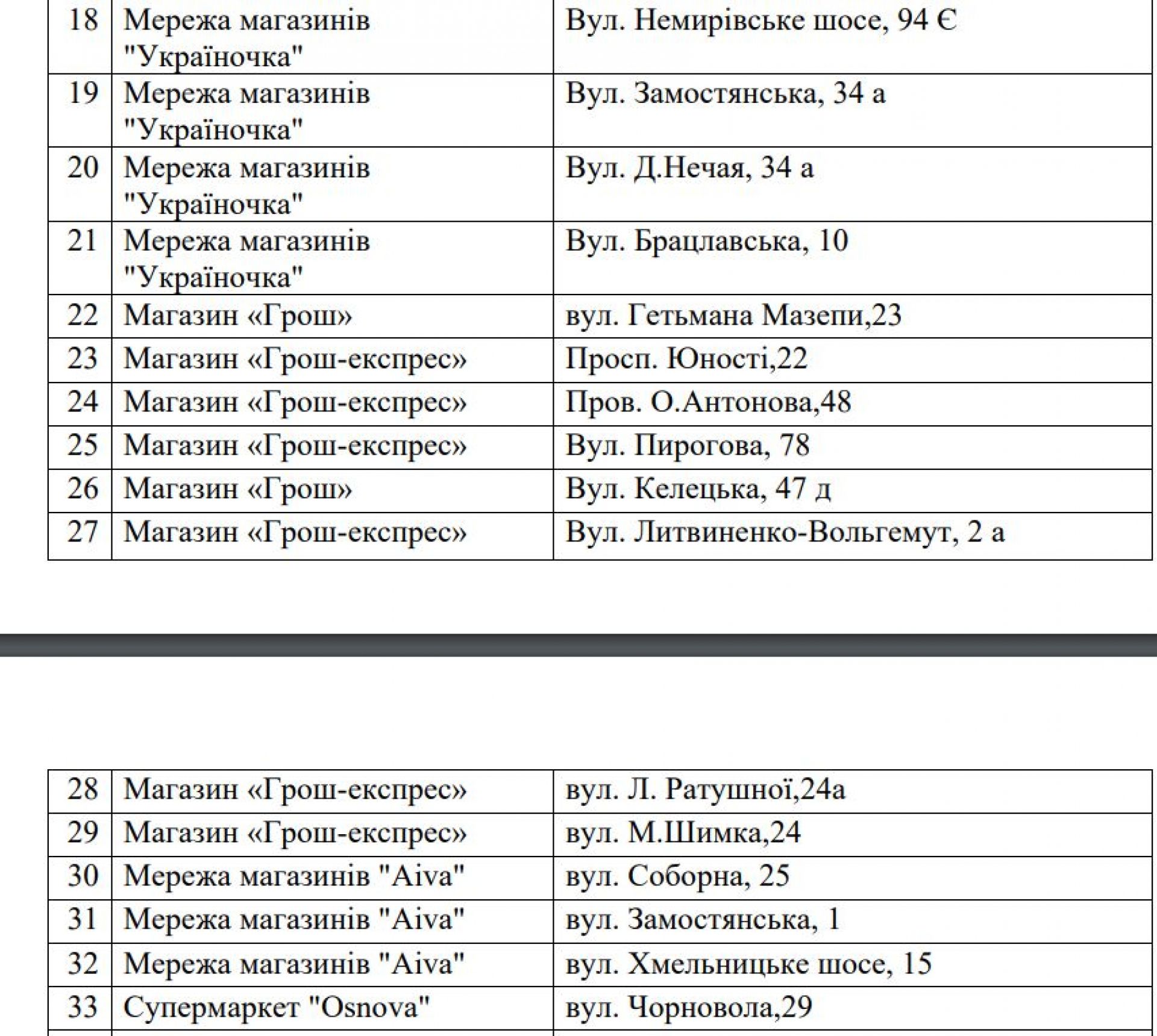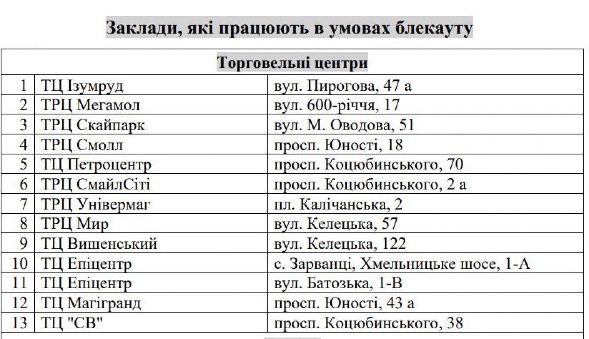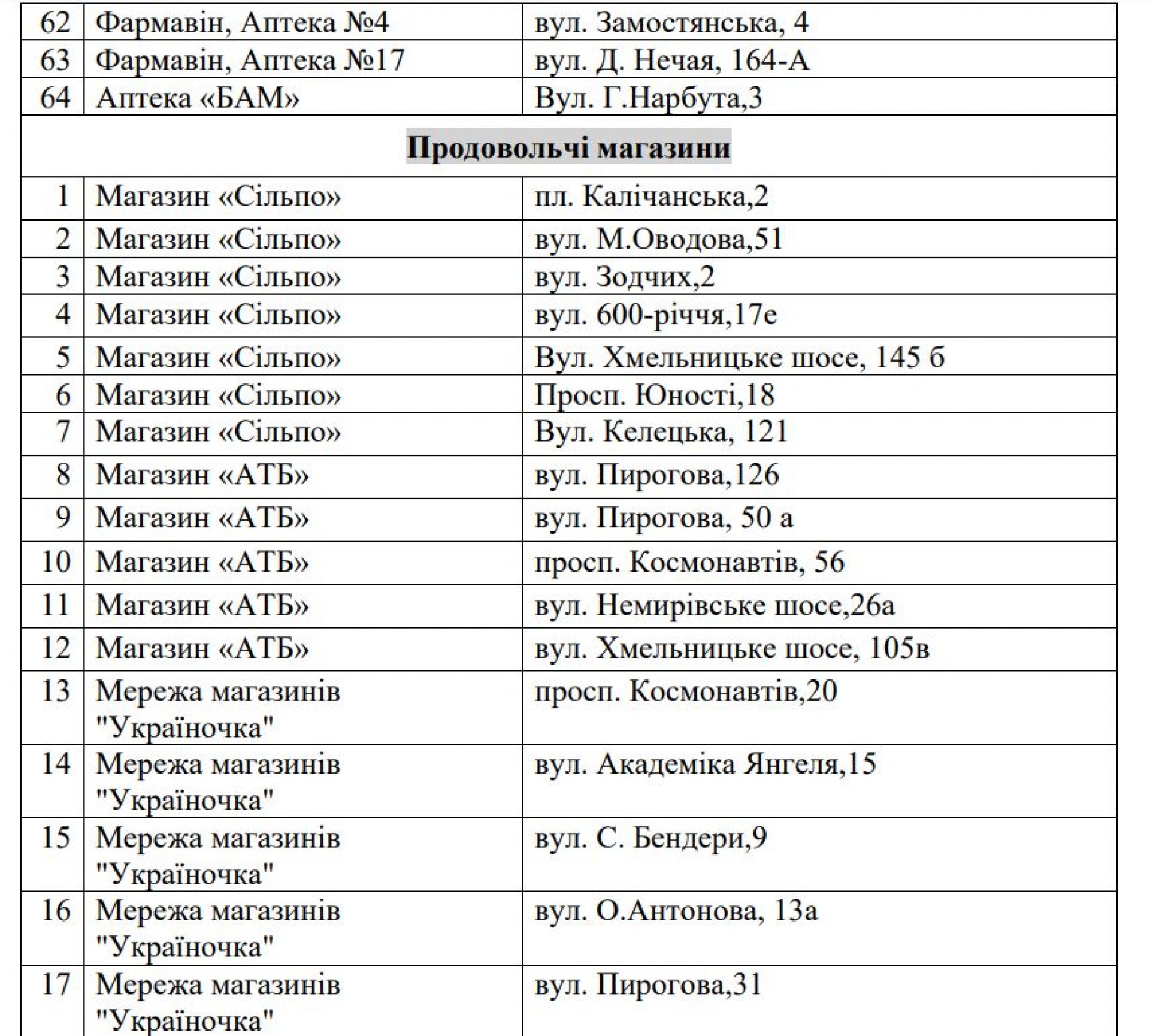 Перелік пунктів незламності та обігріву, розливу води, аптек, ветеринарних клінік, АЗС, банків, лікарень та іншого ТУТ.