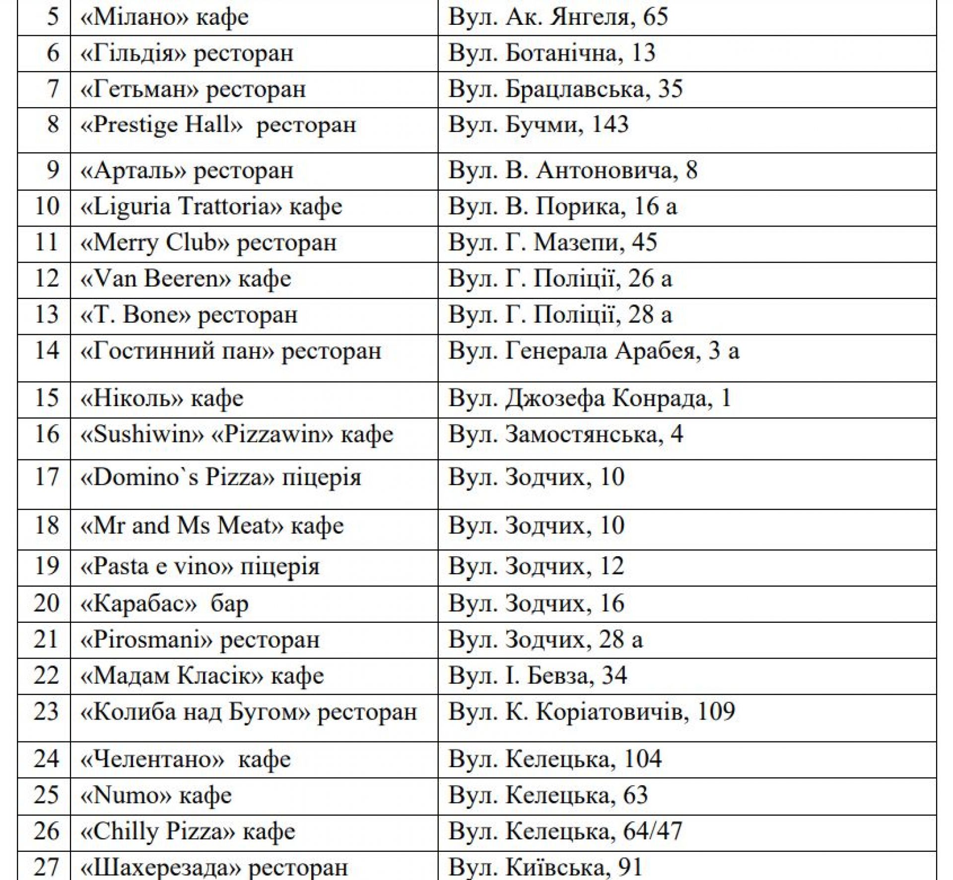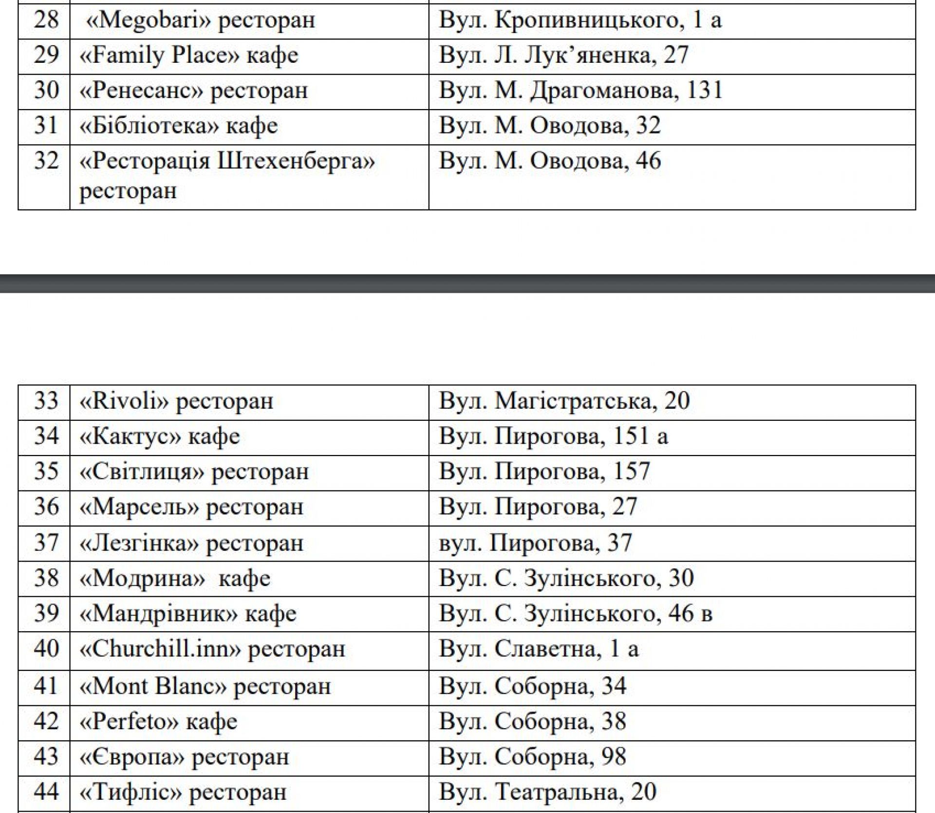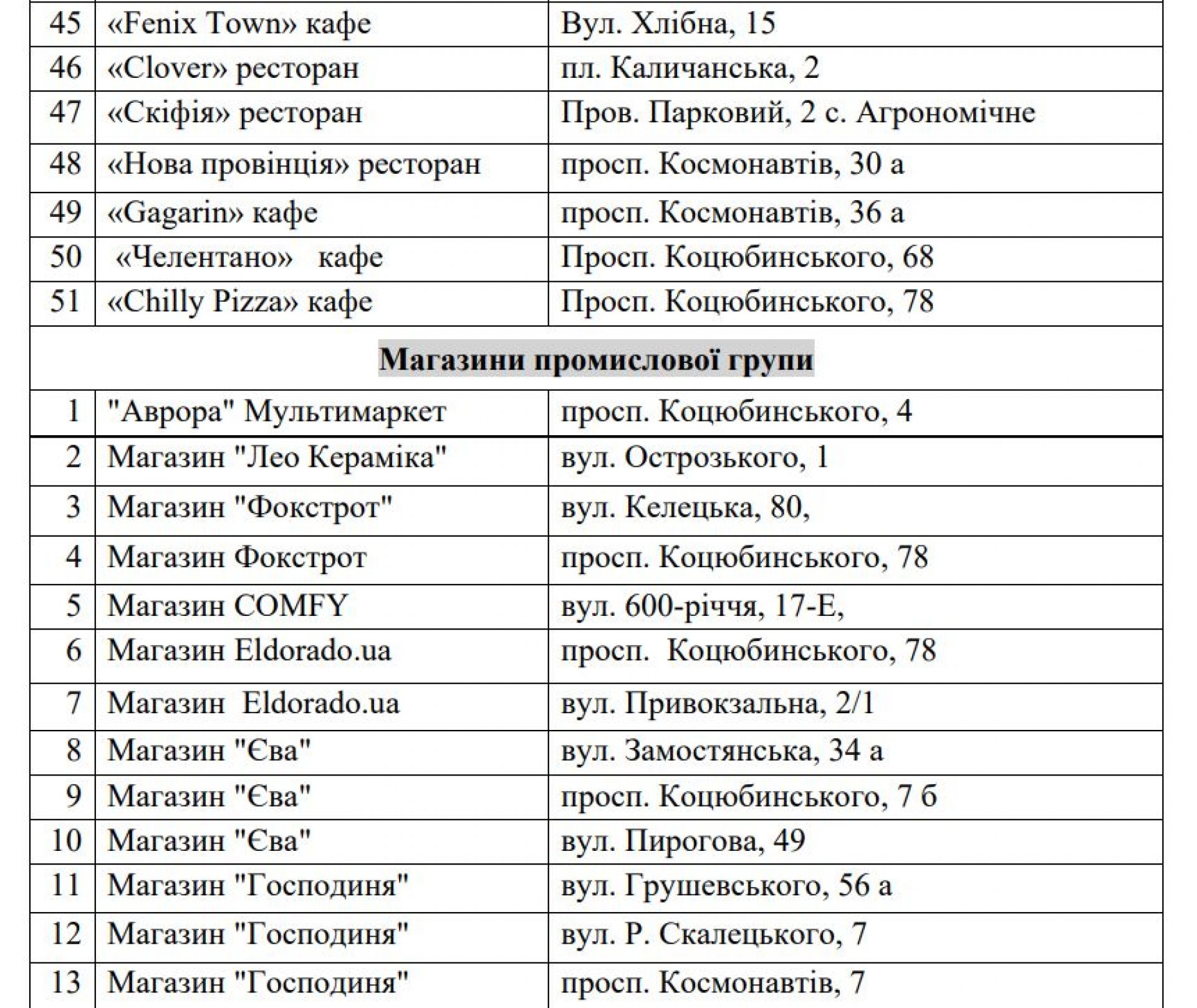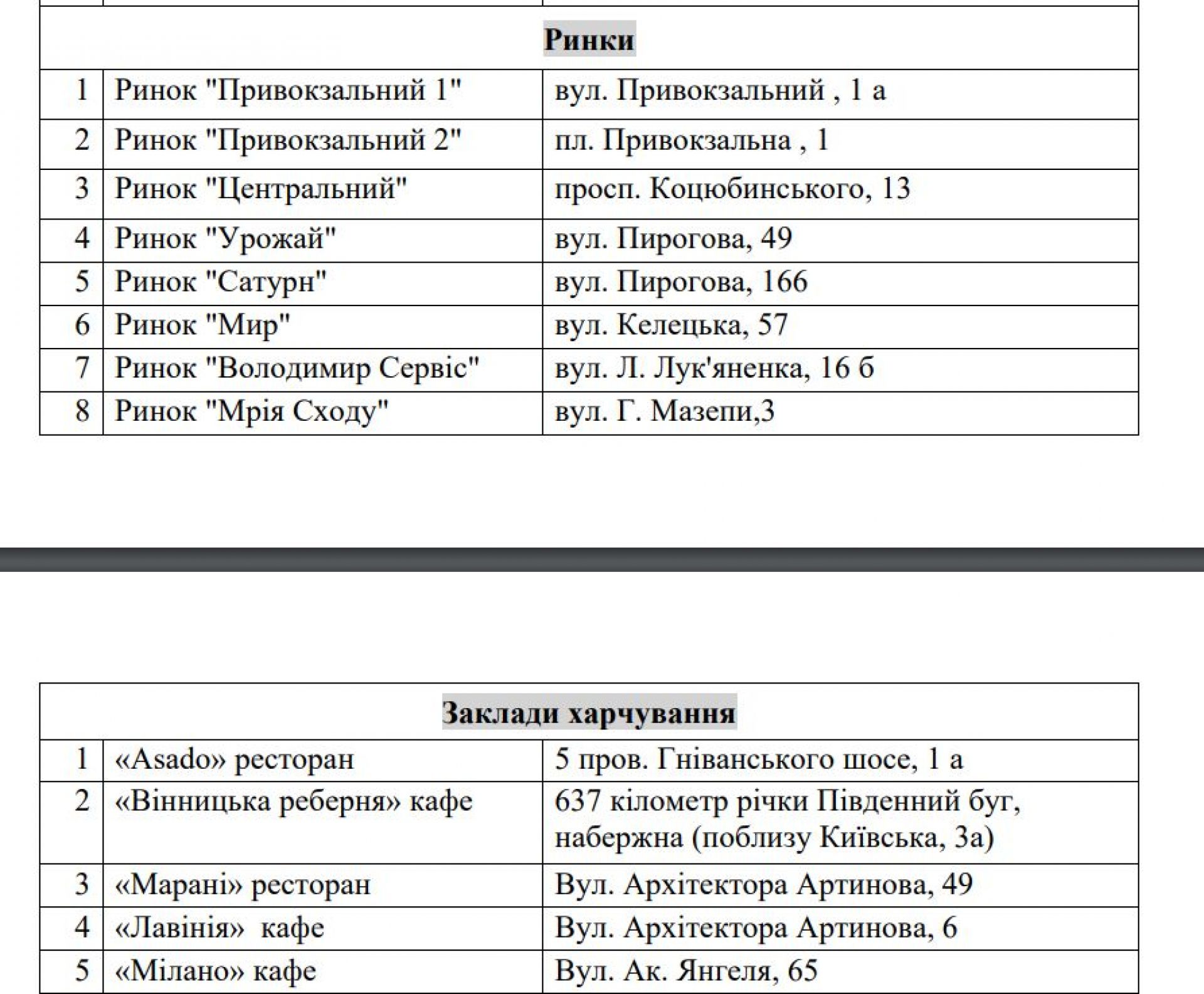 Заклади харчування. Зможуть приймати відвідувачів кав'ярні, ресторани, піцерії - адреси за посиланням https://www.google.com/maps/d/viewer?mid=16sUkwZDy-qqWE5Xa1jkEjdkxUmzdpho&ll=49.235885577293786,28.465990000000005&z=13