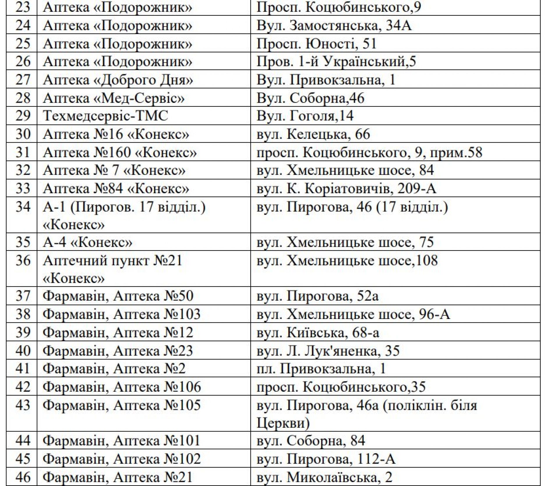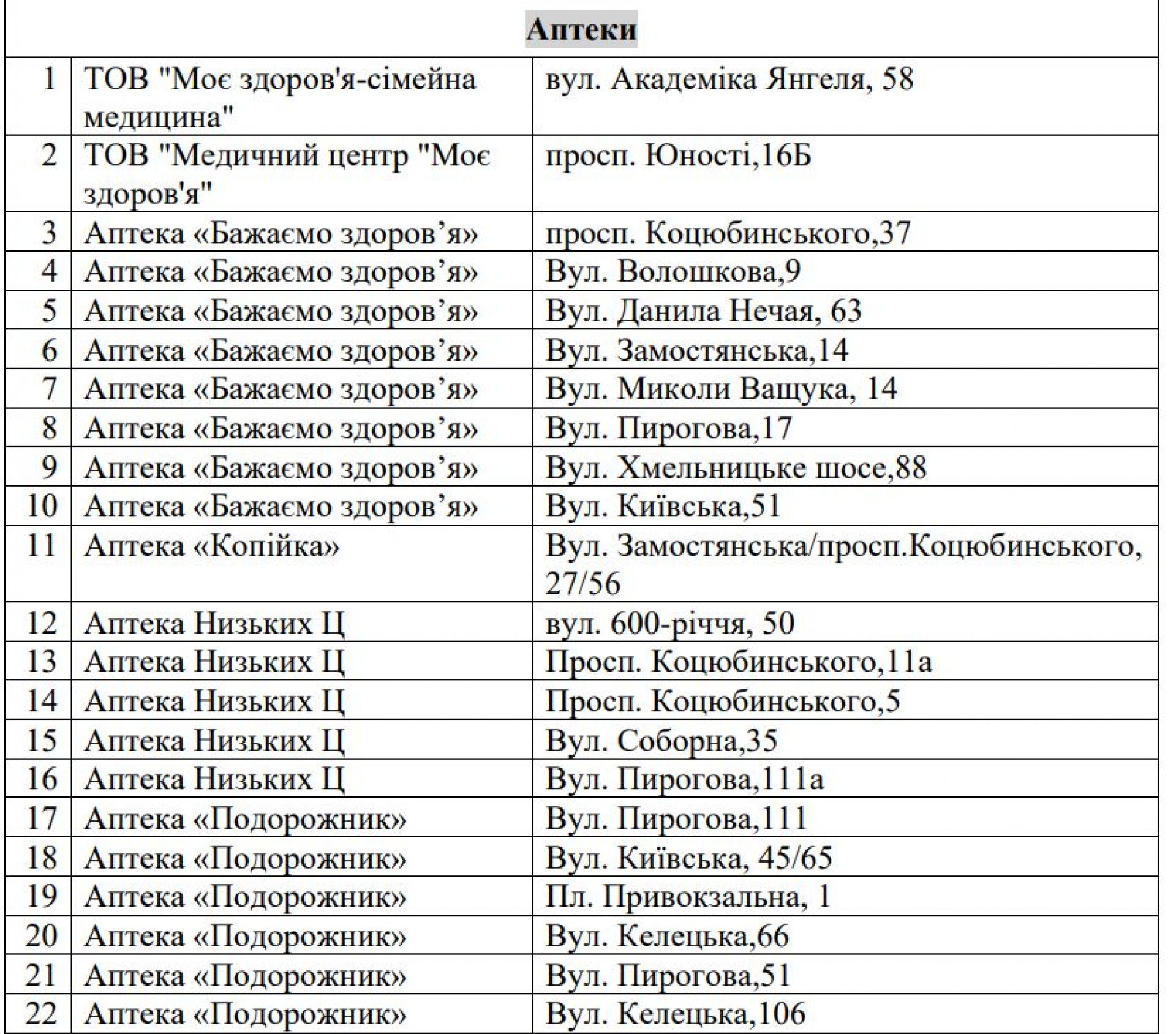 Медичні заклади. Комунальні міські лікарні забезпечені генераторами та продовжать надавати медичну допомогу населенню. Перелік стоматклінік https://www.google.com/maps/d/viewer?mid=1flUeICWhYZR4zNZynXLDfL6StXzPSUQ&ll=49.236777407943286,28.464869053039553&z=13
