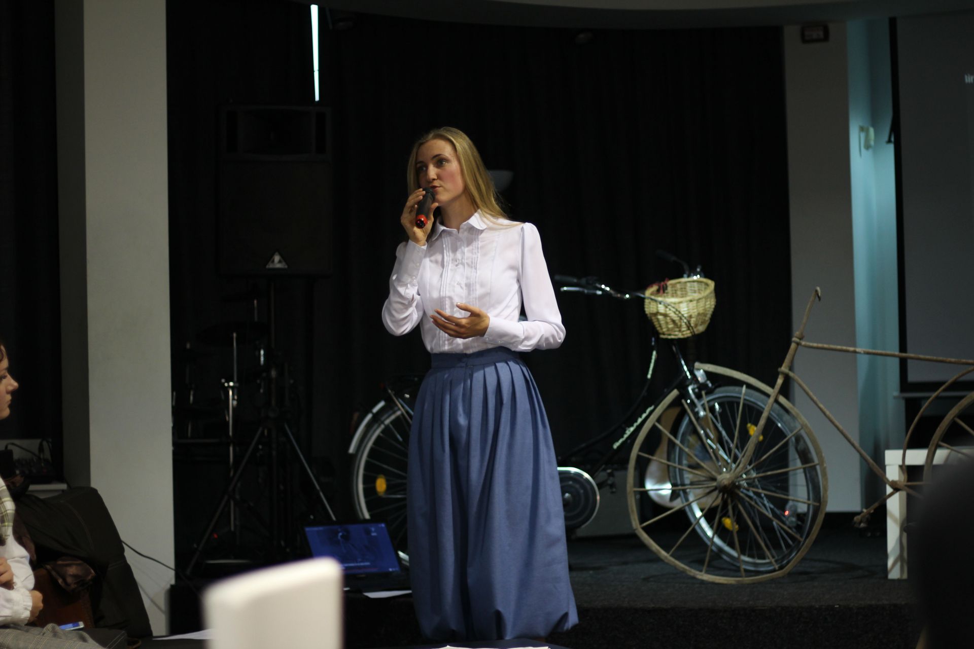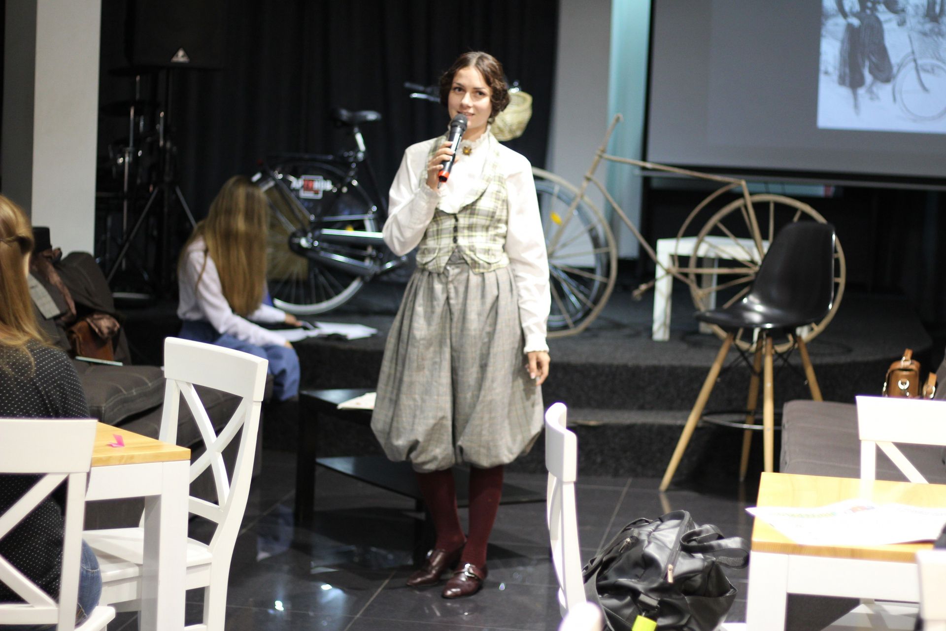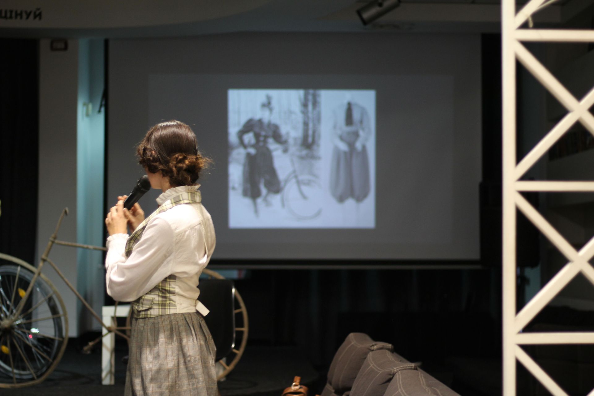 Реконструкторка історії Міла Поворознюк в образі велосипедистки початку 20 століття.