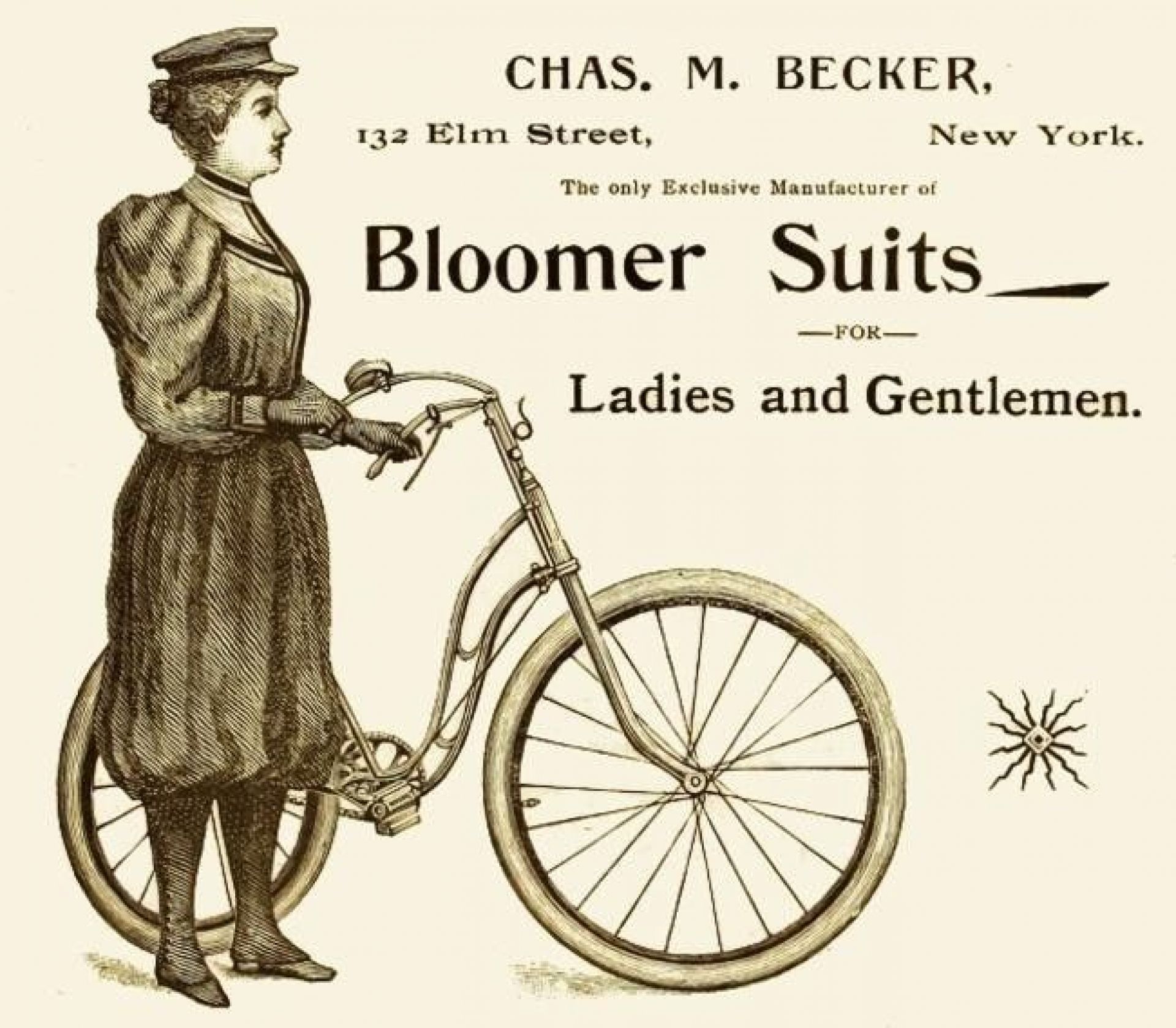 Тодішня мода полягала у багатошарових сукнях, в яких було незручно їздити на велосипеді. Рішення запропонувала американка Амелія Блумер — вона їздила в штанах, схожих на турецькі шаровари з манжетами, які щільно прилягали до кісточок.