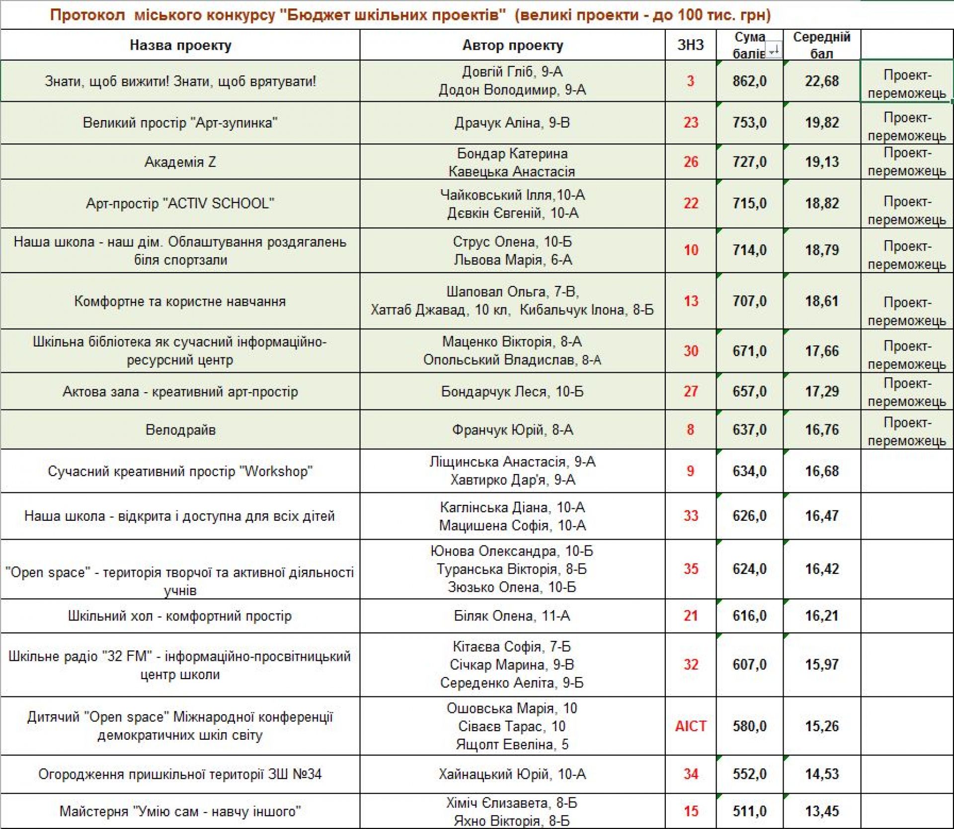 — Рішення, яке ухвалили депутати міськради, закладає щорічне фінансування на цей конкурс. Воно буде «гнучким»: якщо буде багато ідей, тоді будемо писати запит на більше фінансування для проектів, — сказала Яценко. — Цього року виділили 1 мільйон гривень. Була висока активність серед школярів: з 36 шкіл подалася 21.