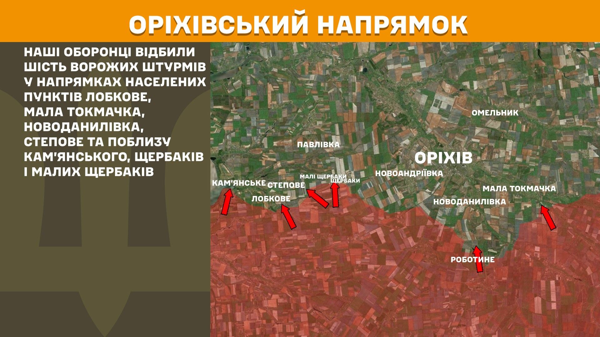 На Оріхівському напрямку наші оборонці відбили шість ворожих штурмів у напрямках населених пунктів Лобкове, Мала Токмачка, Новоданилівка, Степове та поблизу Кам’янського, Щербаків і Малих Щербаків.