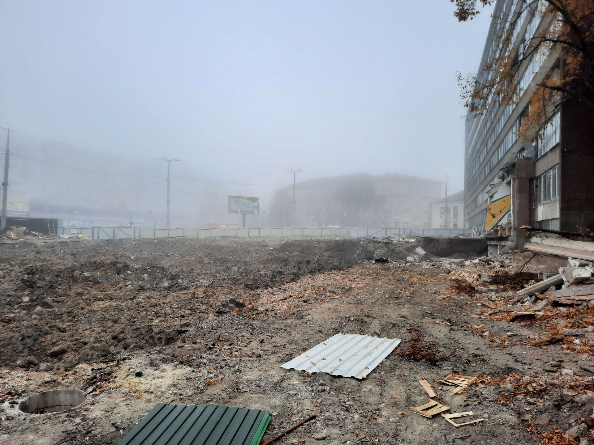 Приходимо сьогодні, 27 жовтня, до готелю. На місці колишнього фоє та ресторану вже вирили котлован. Стоїть екскаватор.