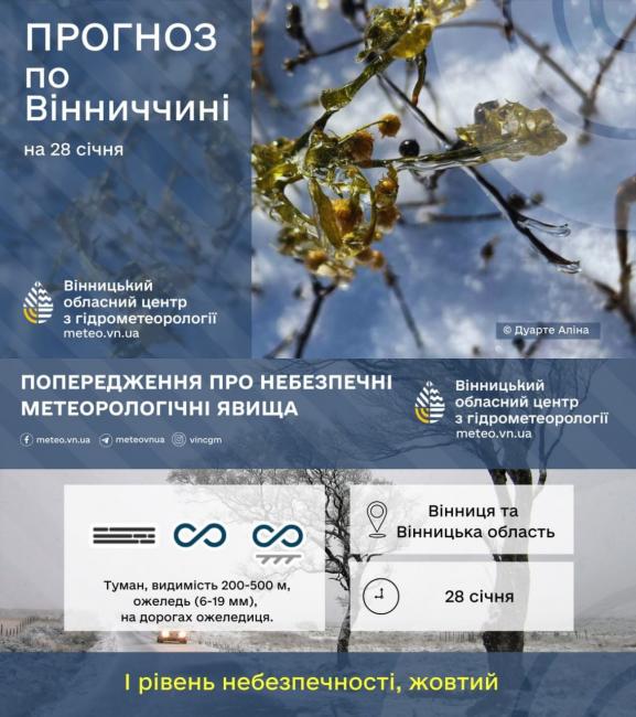 Тим часом синоптики попереджають: погодні умови на Вінниччині й надалі залишатимуться складними. У середу, 28 січня, в області прогнозують хмарну погоду з невеликим мокрим снігом і дощем. Місцями очікується туман, ожеледь та слизькі дороги.