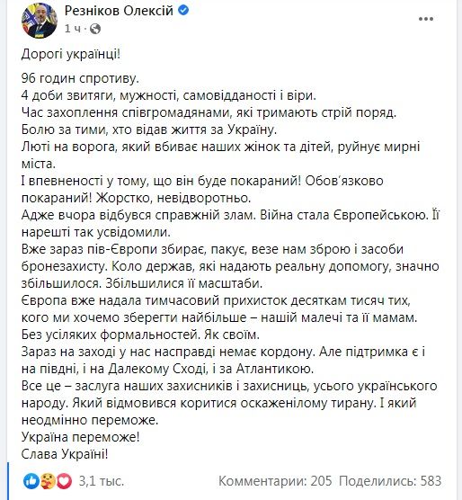 Міністр оборони Олексій Резніков у Facebook звернувся до українців зі словами вдячності і гордості.