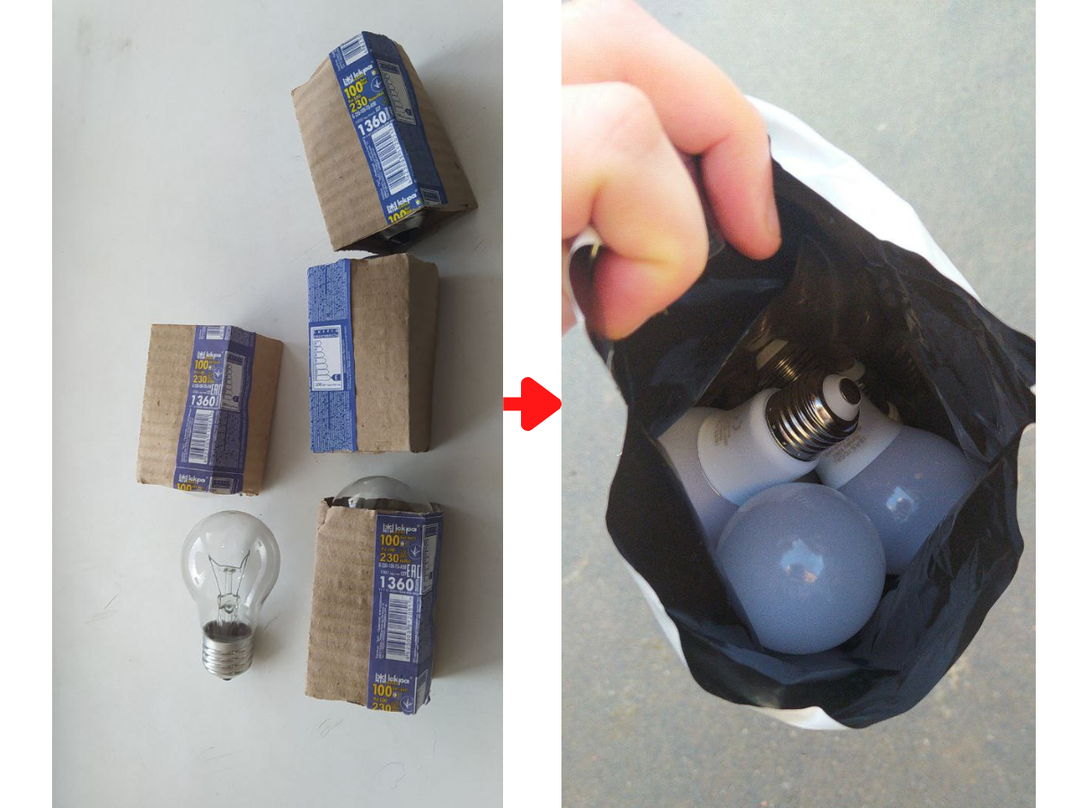 Далі взяла для обміну п’ять ламп розжарювання, які, до слова, на відділенні не перевіряють (за постановою уряду №25 від 10 січня 2023 року приймають тільки справні лампочки розжарювання - авт.). А потім видала у пакеті п’ять енергоефективних ламп.
