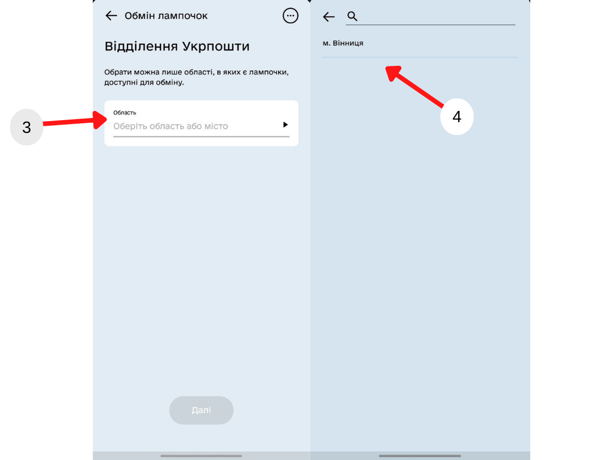 Форма дуже проста: від вас потрібно спочатку обрати регіон та місто. На 1 лютого була доступна тільки Вінниця, але зараз лампочки можна забирати як у районних центрах, так і в деяких селах: актуальний список дивіться по своєму районі в «Дії».