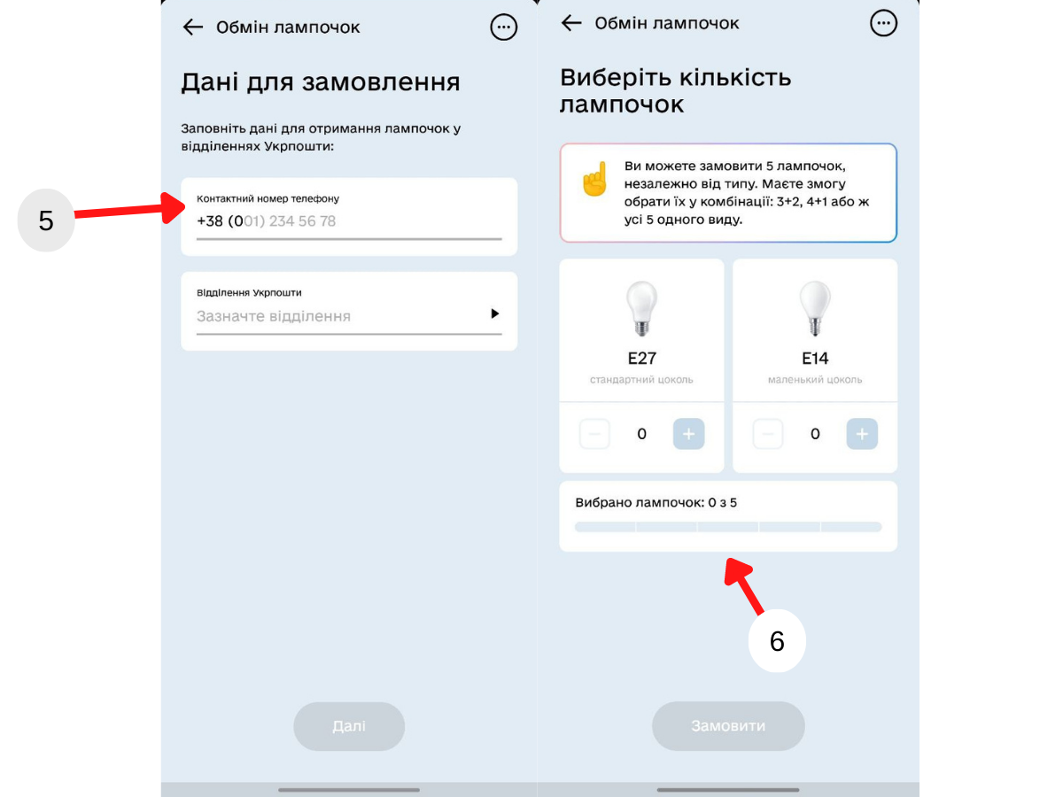 Далі, треба вказати свій номер телефону і відділення «Укрпошти», в якому ви хочете забрати лампочку.