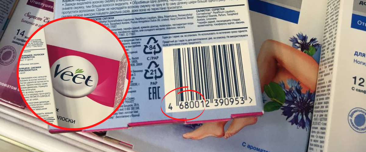 Спершу ми завітали у крамницю з товарами для краси й здоров'я Eva. Там ми помітили воскові смужки для епіляції компанії Veet з російським штрих-кодом. Ще буквально тиждень тому їх не було на прилавках, але ось знову повернулися.