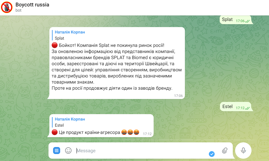 Також ще один український розробник зробив телеграм-бот BoycottRussiaBot. Ця база теж постійно оновлюється. Вам потрібно написати лише назву товару, а бот — покаже, як компанія відреагувала на велику війну в Україні.