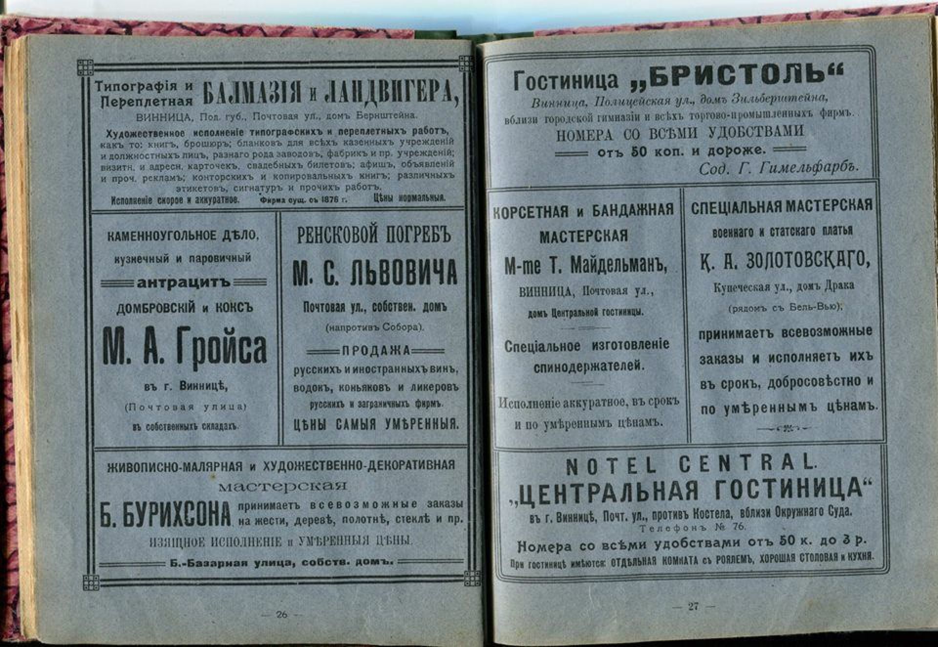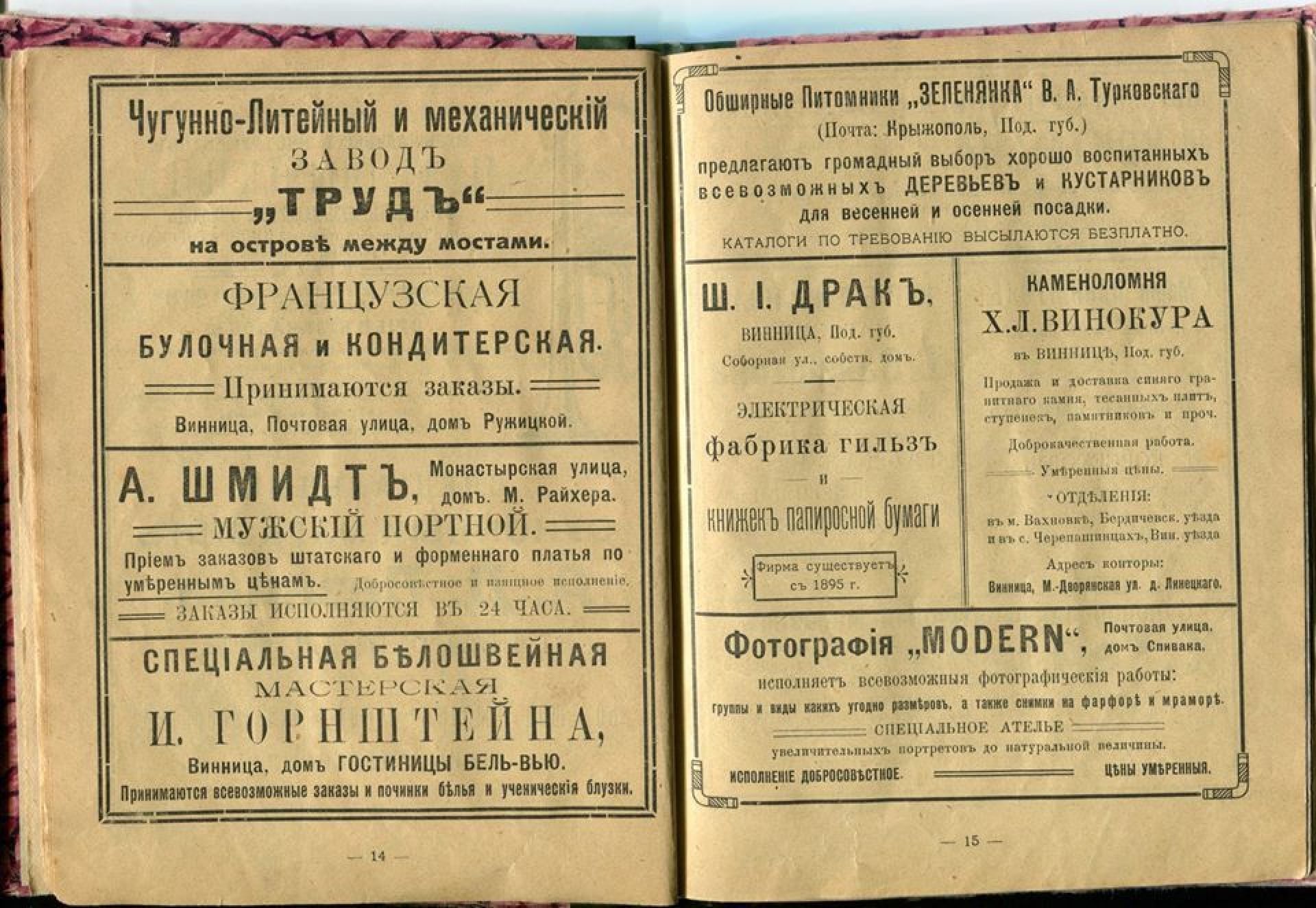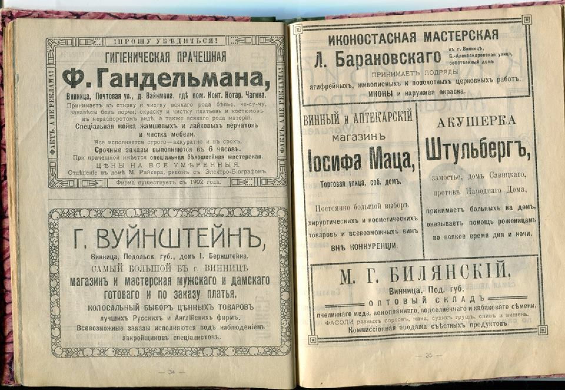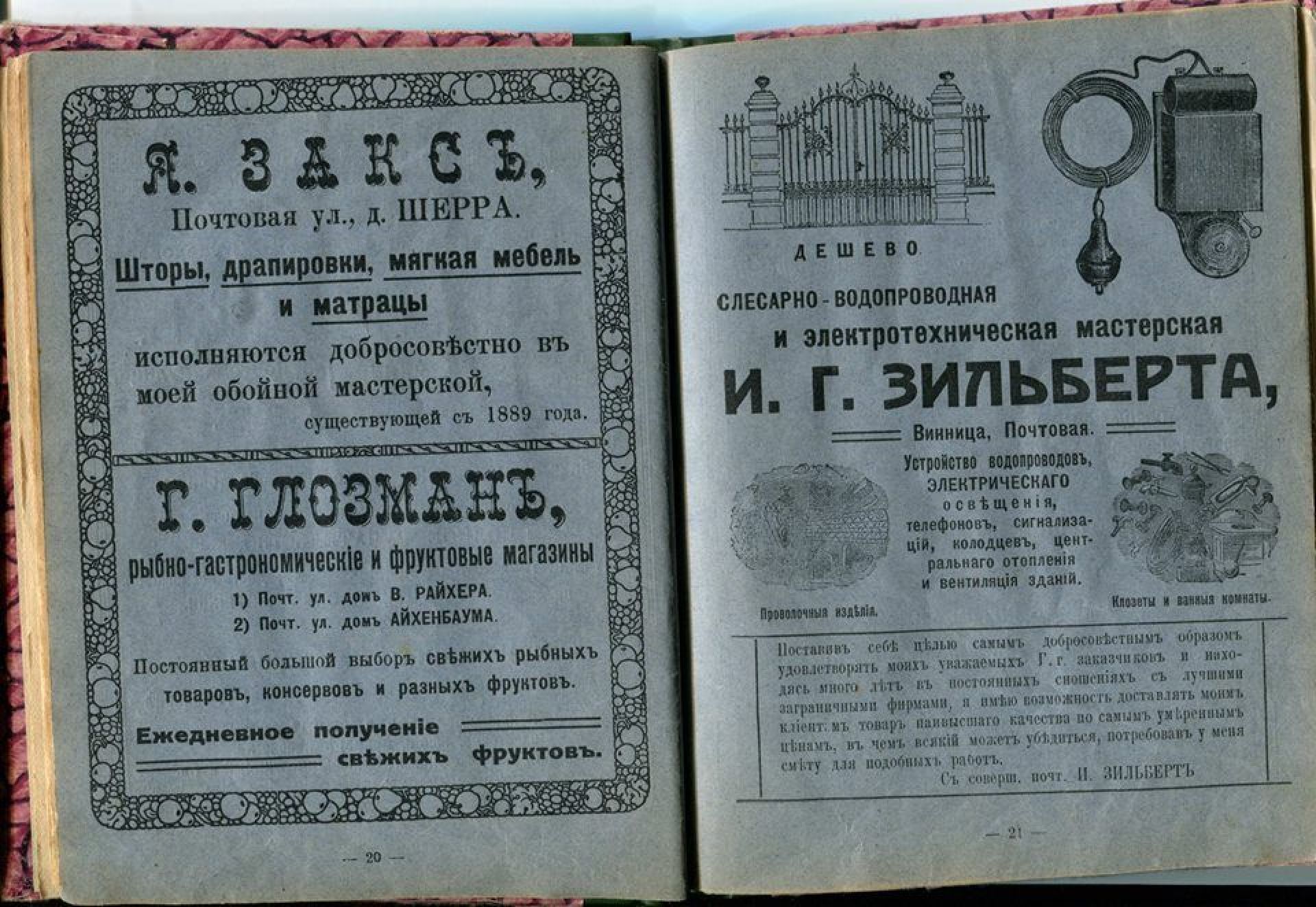 На сайті myshtetl.org є сторінка про туристичні принади Вінниці та її єврейське минуле. Зокрема, опублікували фото довідника за 1911 рік, де зібрані рекламні оголошення та комерційні пропозиції підприємців того часу. Передивилися їх, щоб дізнатися, що продавали і пропонували у Вінниці понад століття тому.
