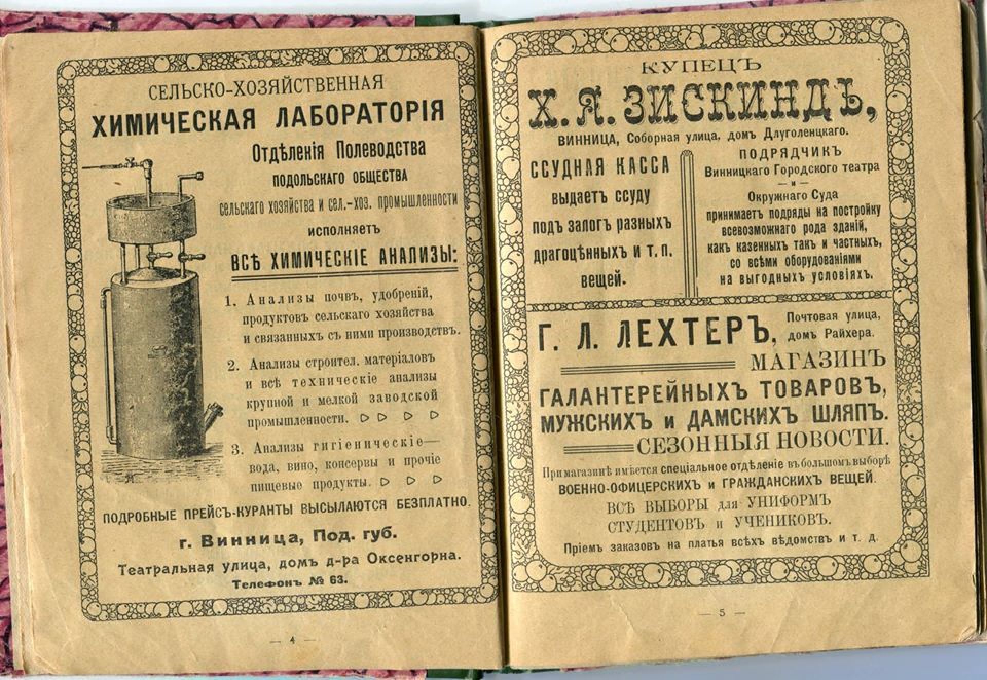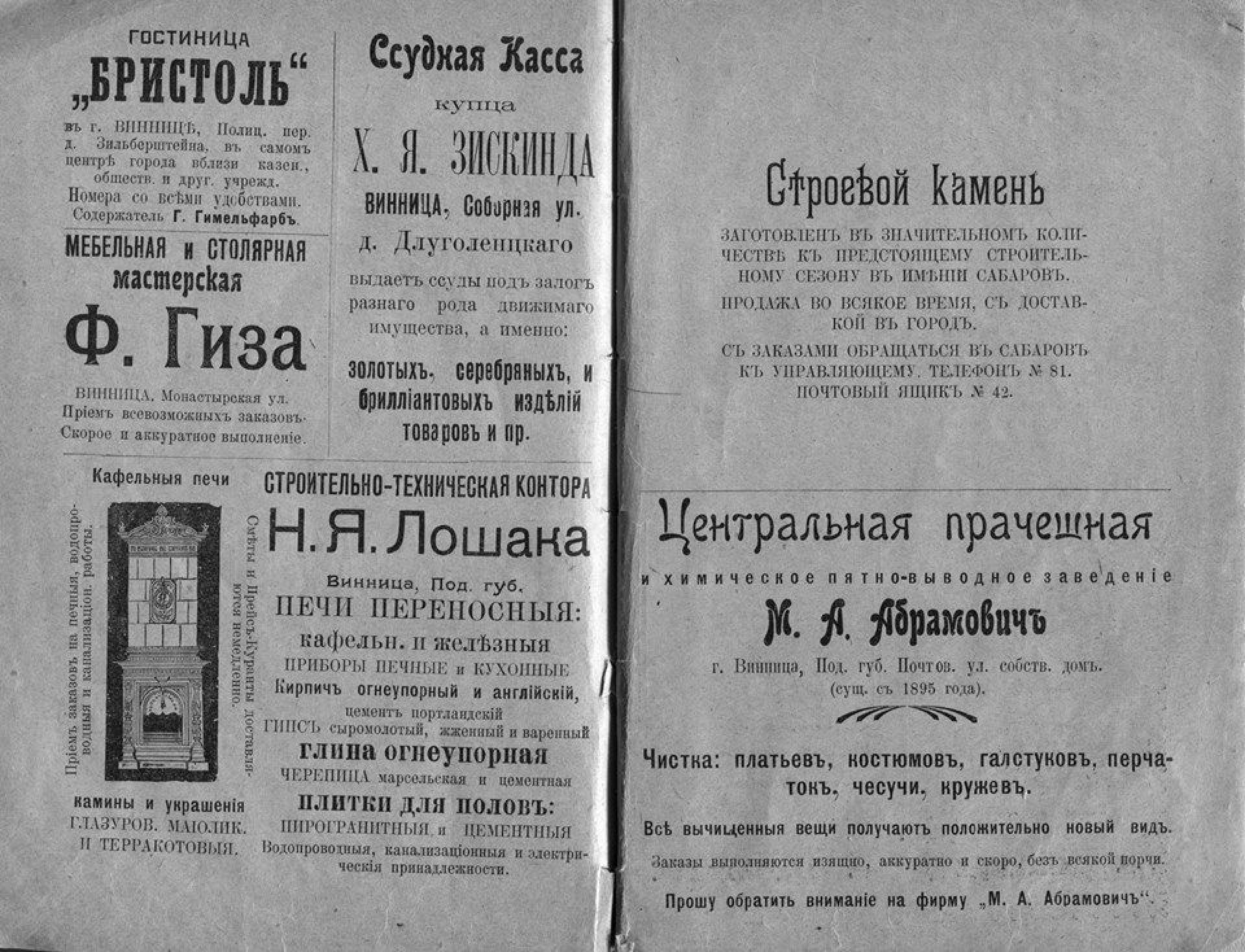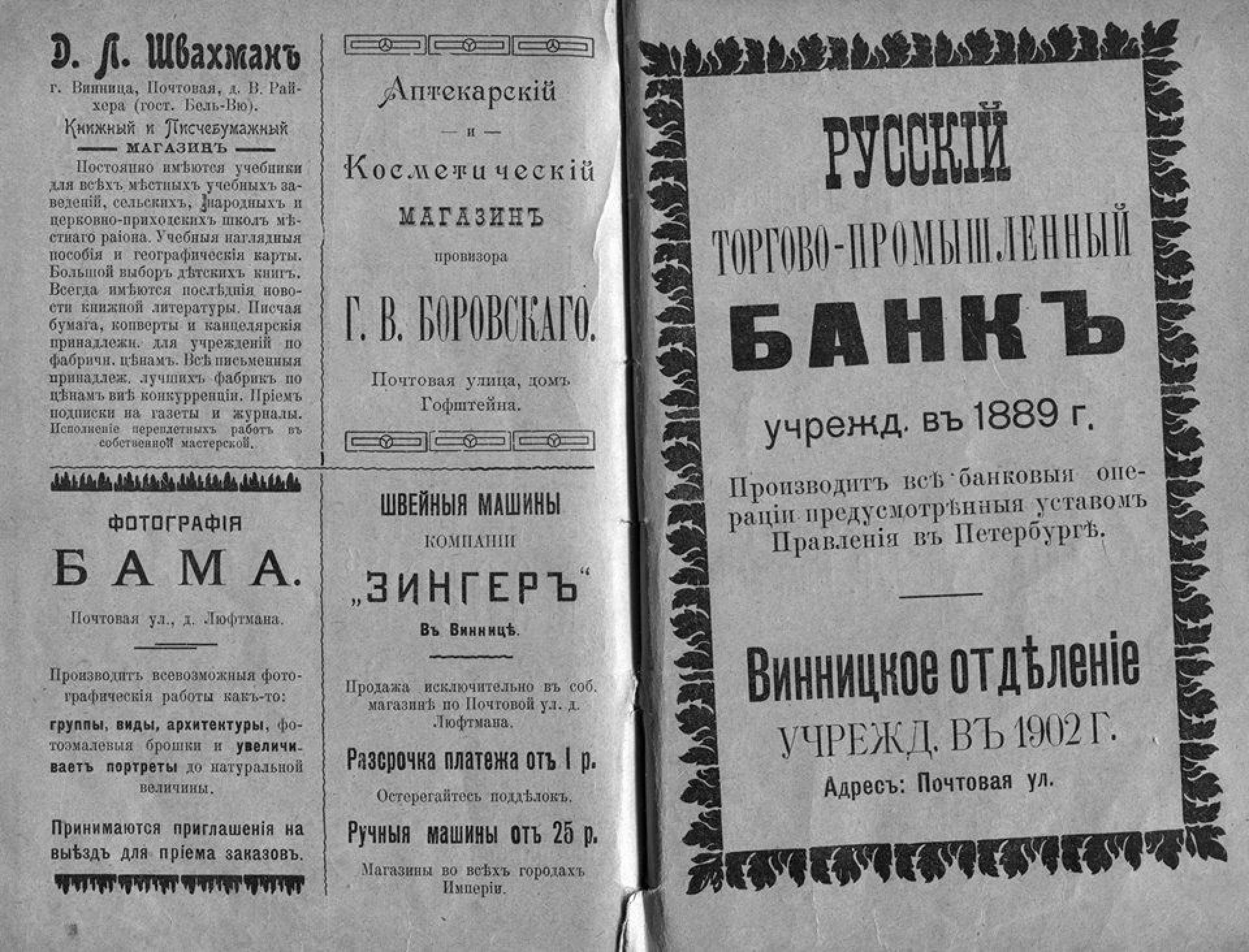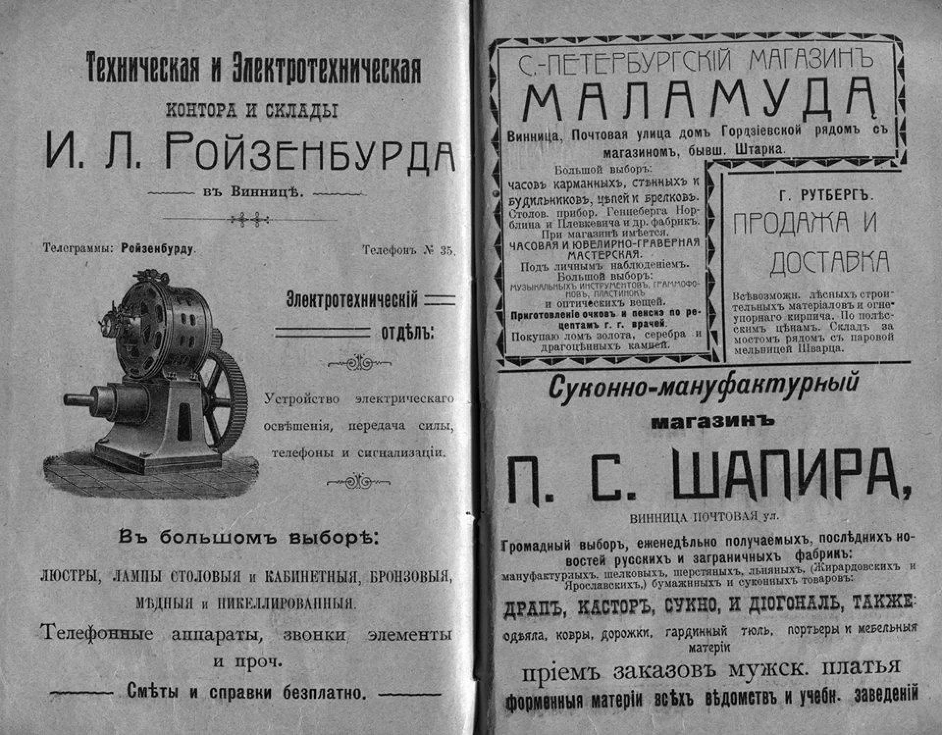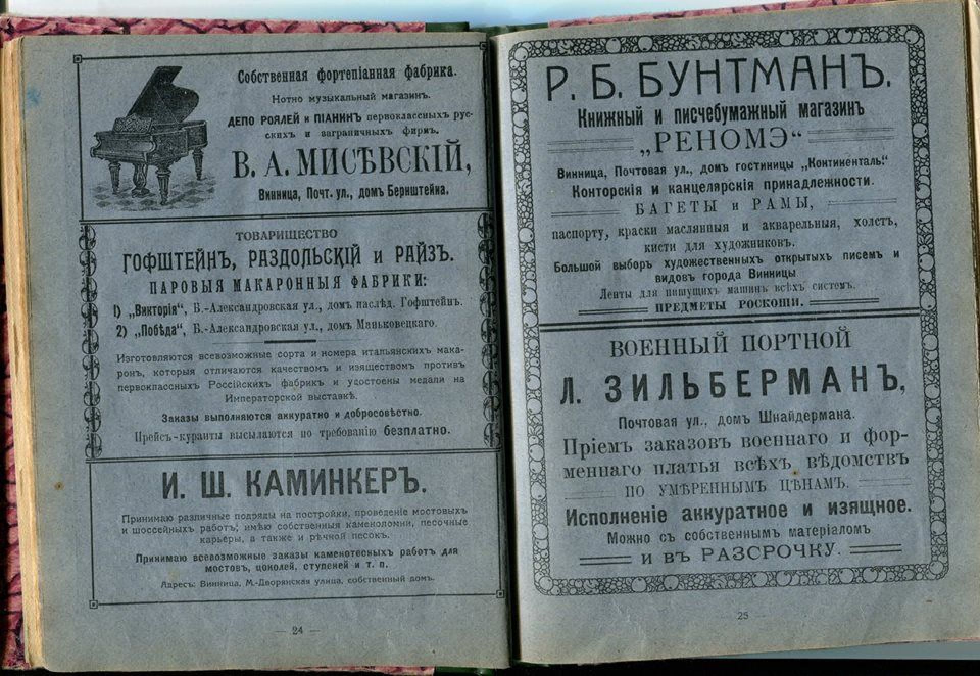 На сайті myshtetl.org є сторінка про туристичні принади Вінниці та її єврейське минуле. Зокрема, опублікували фото довідника за 1911 рік, де зібрані рекламні оголошення та комерційні пропозиції підприємців того часу. Передивилися їх, щоб дізнатися, що продавали і пропонували у Вінниці понад століття тому.