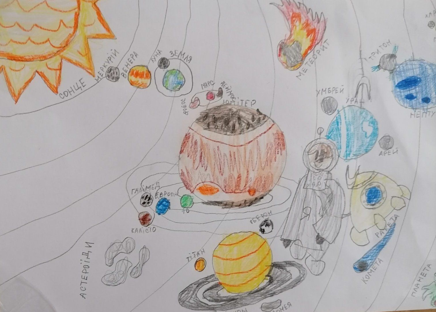 — Років зо три тому дитина зацікавилася планетами і відтоді це його улюблена тема. Йому подобається все, що пов’язано з планетами. Він дивиться розповіді в Інтернеті, малює планети на малюнках. Він знає про них більше, ніж знаємо ми з донькою.