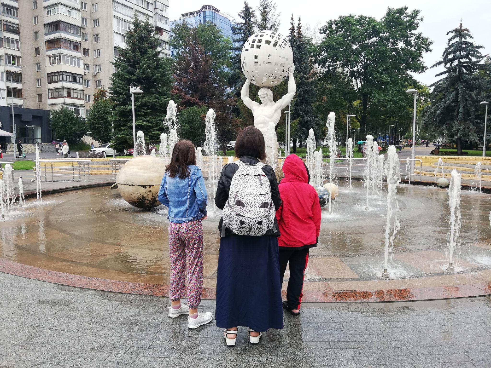 Володя знову зупиняє погляд на фонтані. Показує пальцем по черзі на зображення планет і називає їх. Потім просить маму зробити паперовий кораблик. Пані Олена нарікає, що нема паперу. Вириваю листок з блокнота — через хвилину малий поспішає до води, щоб пустити по ній кораблик.